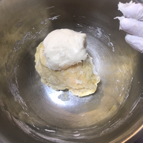 손으로 계속 꽉 쥐어주고 손가락 사이로 반죽 내보내고 뭉쳐주고 꽉 쥐워주고 뭉쳐주고 ㅇ렇게 반복하면 좀 더 잘 섞일거여!