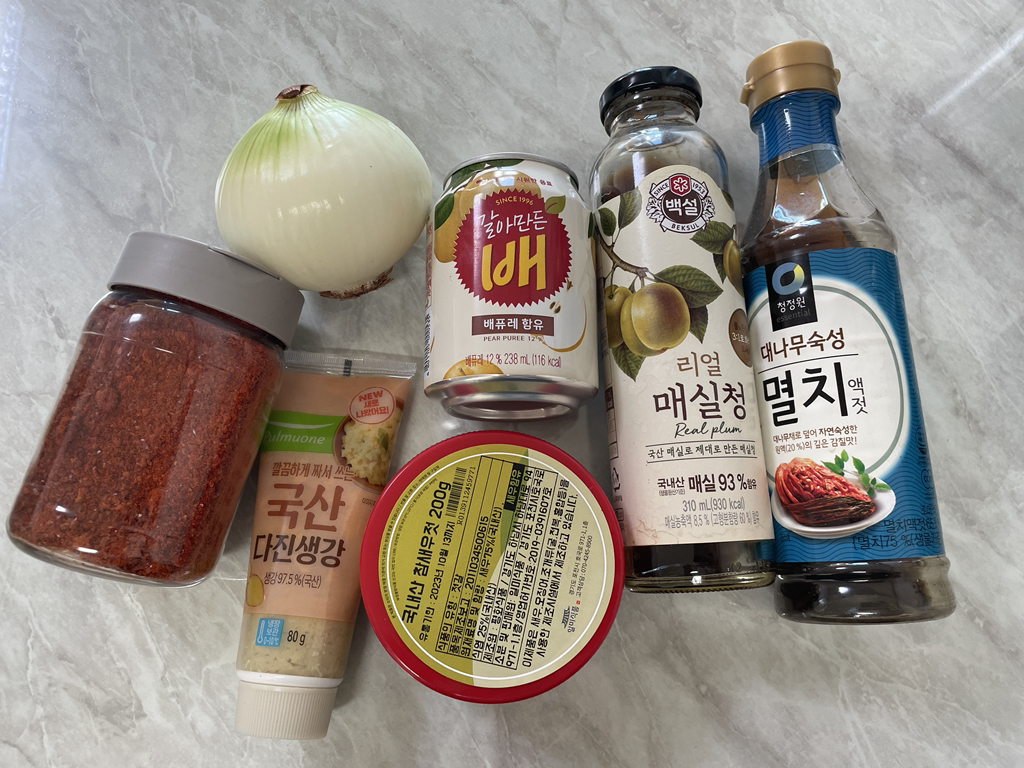 2. 양파1개, 갈아만든 배 반컵, 다진생강 1스푼,