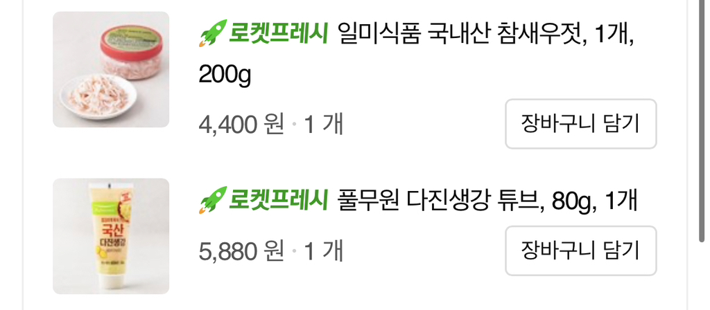 (나는 파김치 만드려고 다진 생강이랑 새우젓 제일 싼걸로 샀고 두개 합해서 만원 들었어!)