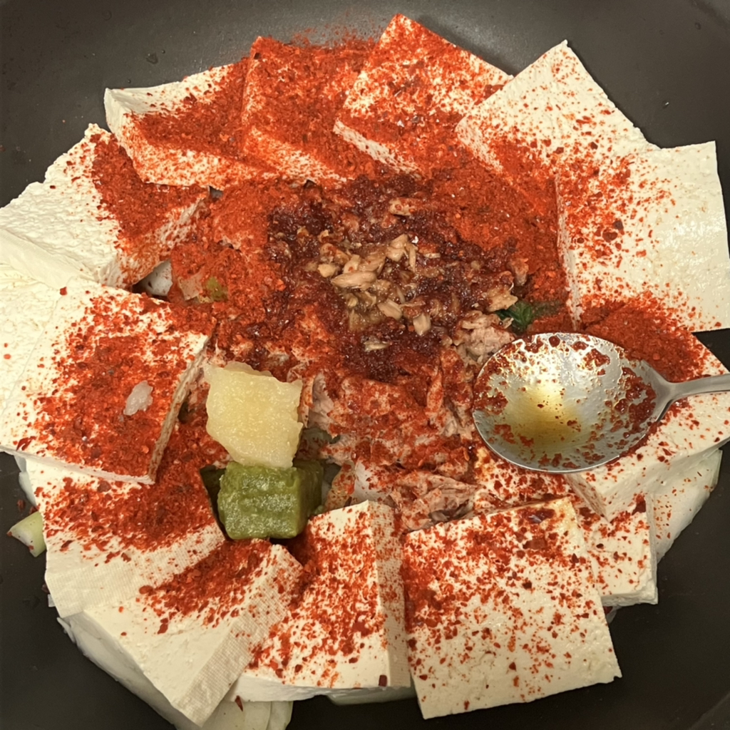 ๋ค์ง๋ง๋ 1 ์คํผ, ์ฒญ์๊ณ ์ถ ์ทจํฅ๊ป, ์ฝ์ธ์ก์ ํ์, ๊ณ ์ถง๊ฐ๋ฃจ 2 ์คํผ, ๊ฐ์ฅ 4 ์คํผ, ์๋ฃฐ๋ก์ค 2 ์คํผ, ๋ฉธ์น์ก์ 1 ์คํผ