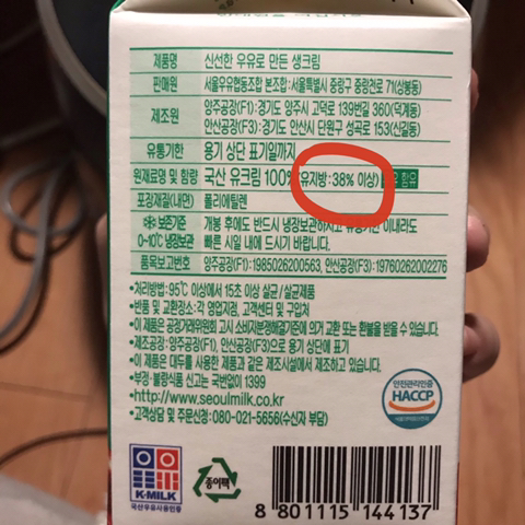 +내가 이틀만에 다먹어버려서 오늘 새로 만들려고 마트 가봤는데 매일 휘핑크림이 있는거야? 유지방은 38프로 인데 132~150도로 고온살균한거더라고ㅠ 혹시나 휘핑크림 대체 가능한지 궁금한 여시들 있을까봐 추가해...!