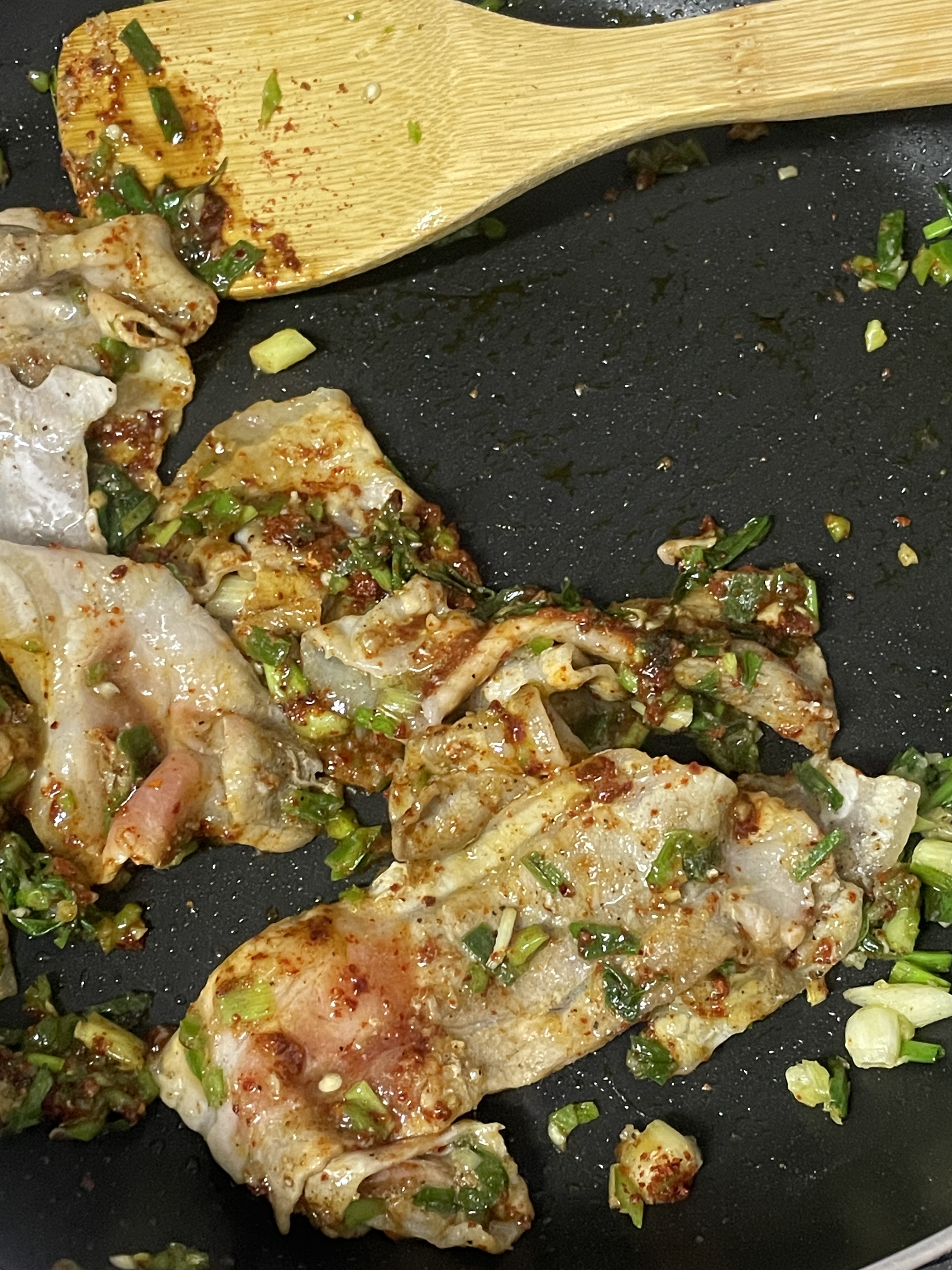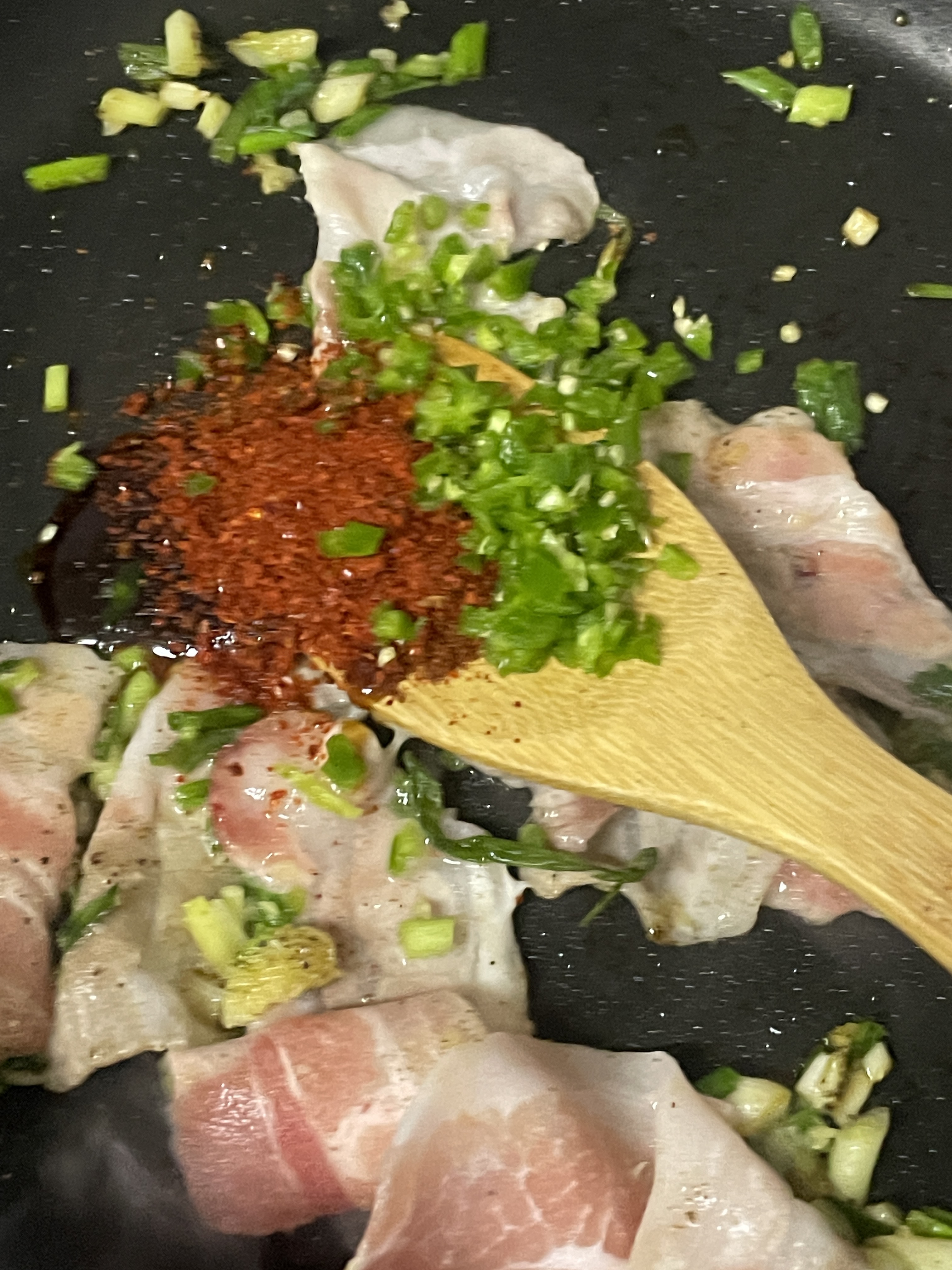 3. 살짝 익었을때 굴소스 한 스푼, 고춧가루 한 스푼, 청양고추 한 개 다져서 볶아주기 (후추 좋아하면 추가)