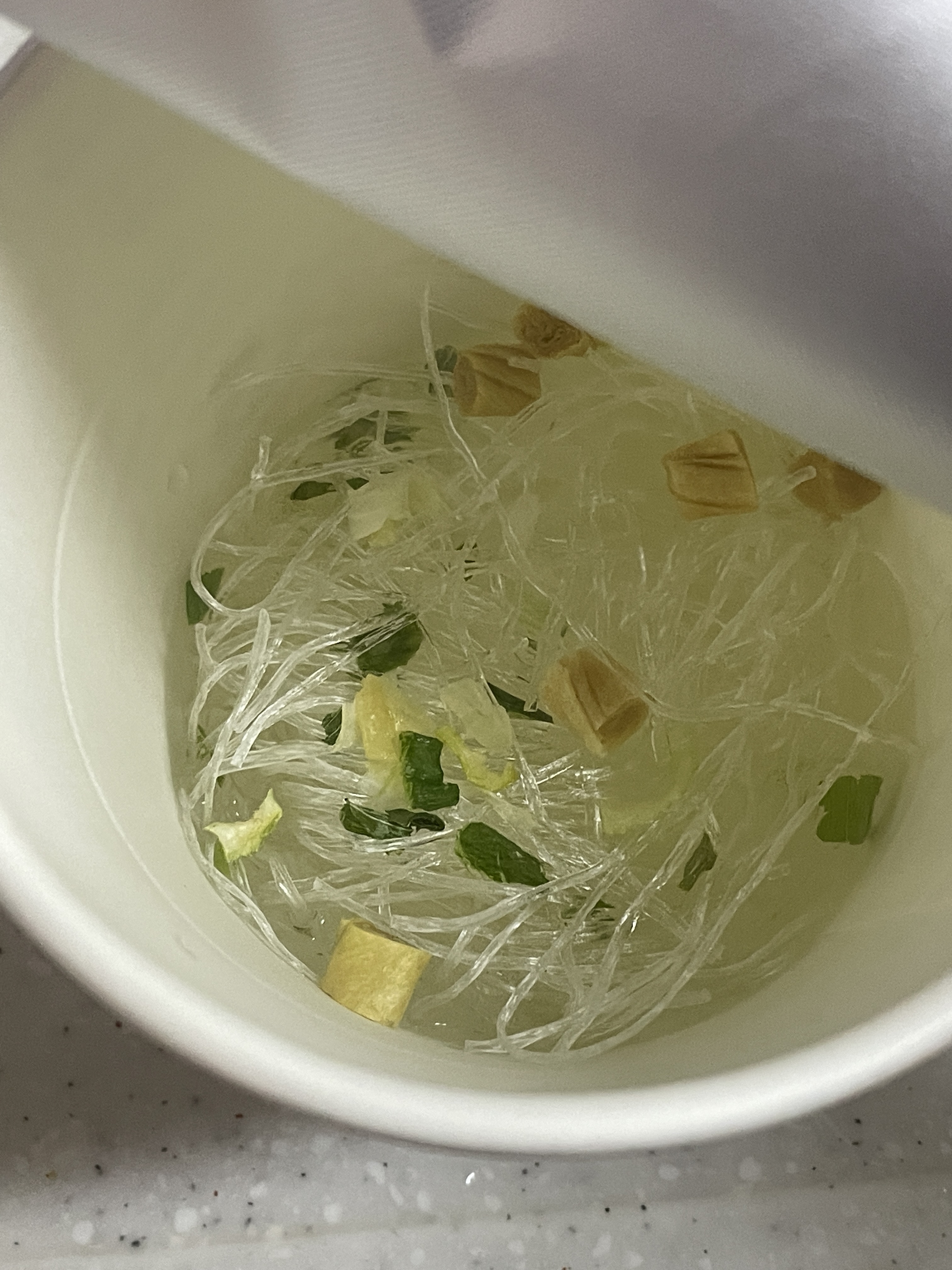 5. 그리고 이때 후레이크 푼 컵누들에 뜨거운 물 부어주기 물 양은 면 살짝 잠길때까지만 부어줘
