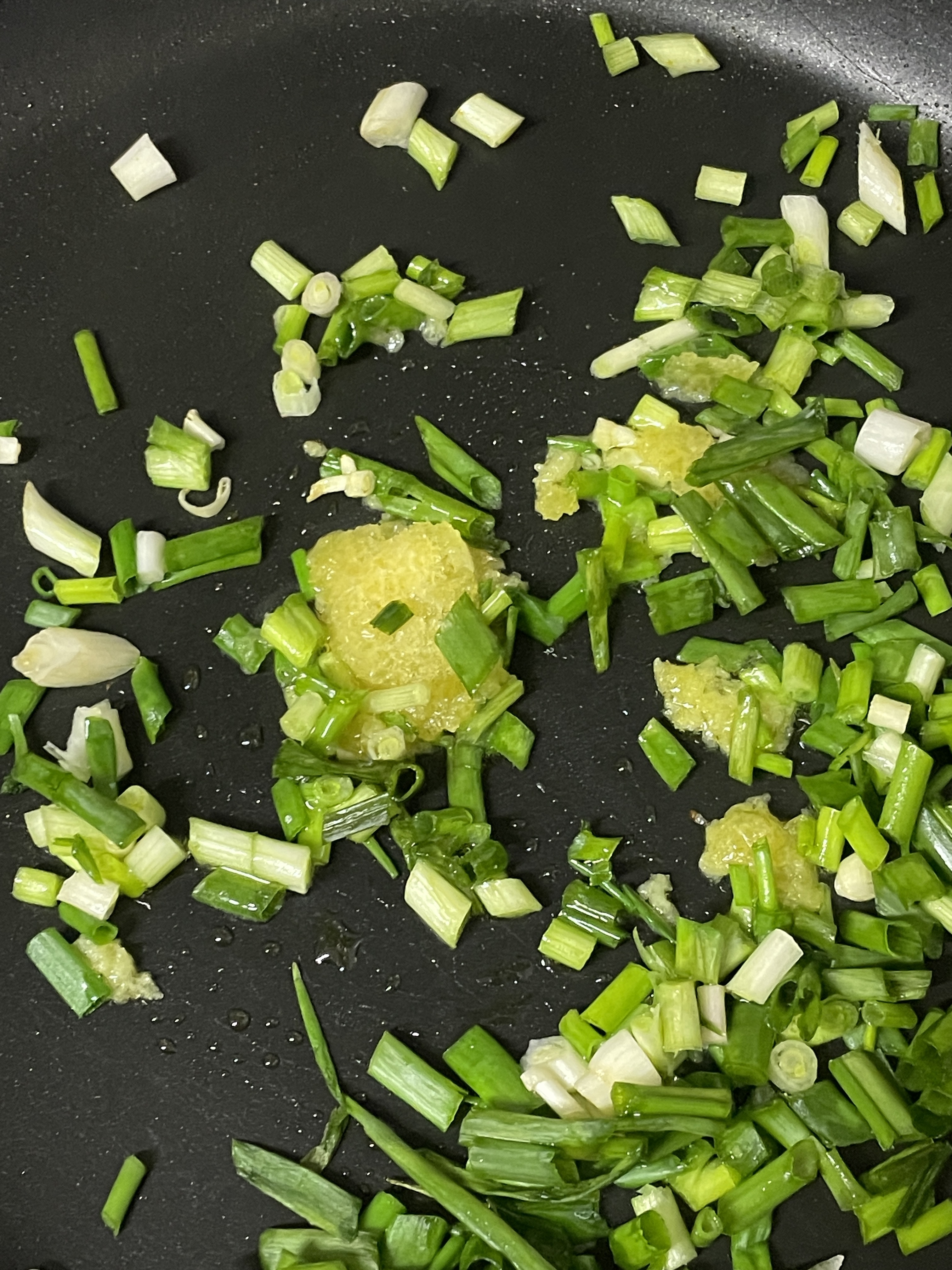 1. 올리브유 한 스푼 두르고 중간 불에 마늘 한 스푼, 파 볶아줘 나는 대파 없어서 쪽파 넣었어ㅎ..
