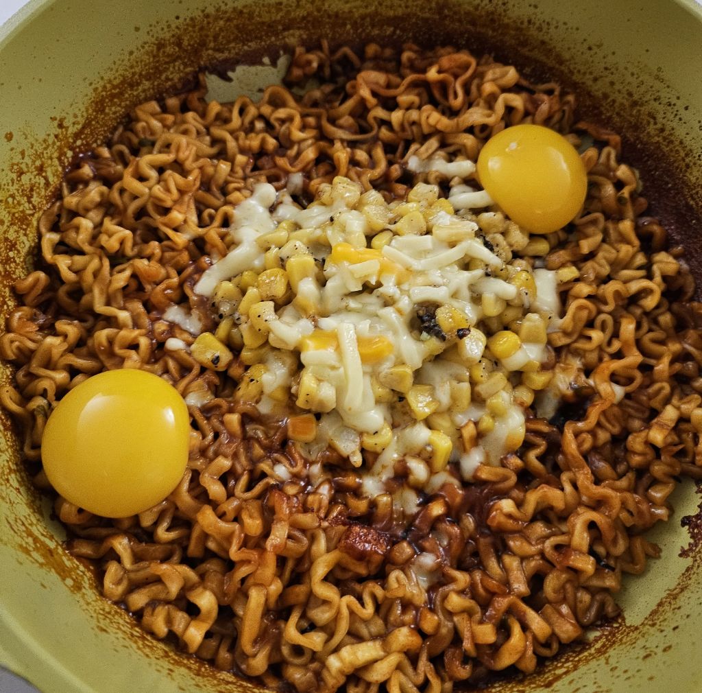 불닭볶음탕면, 스위트콘, 마요네즈, 피자치즈, 계란노른자, 소금, 설탕, 후추