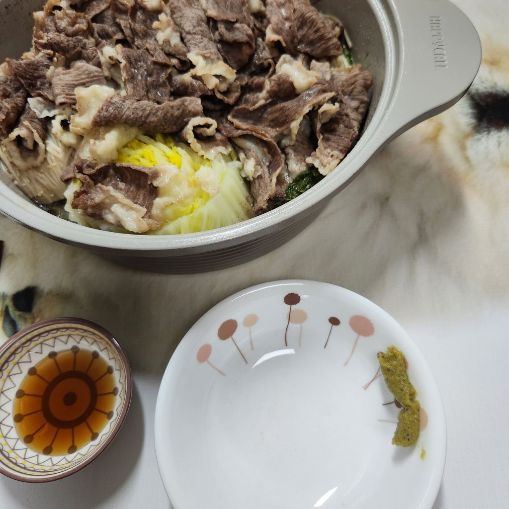 짜잔 알배추랑 고기랑 좋아하는 야채 앞접시에 덜어서 고추냉이 죄금 올리고 참소스 찍어 먹어봐 아아주 맛도리👍🏻