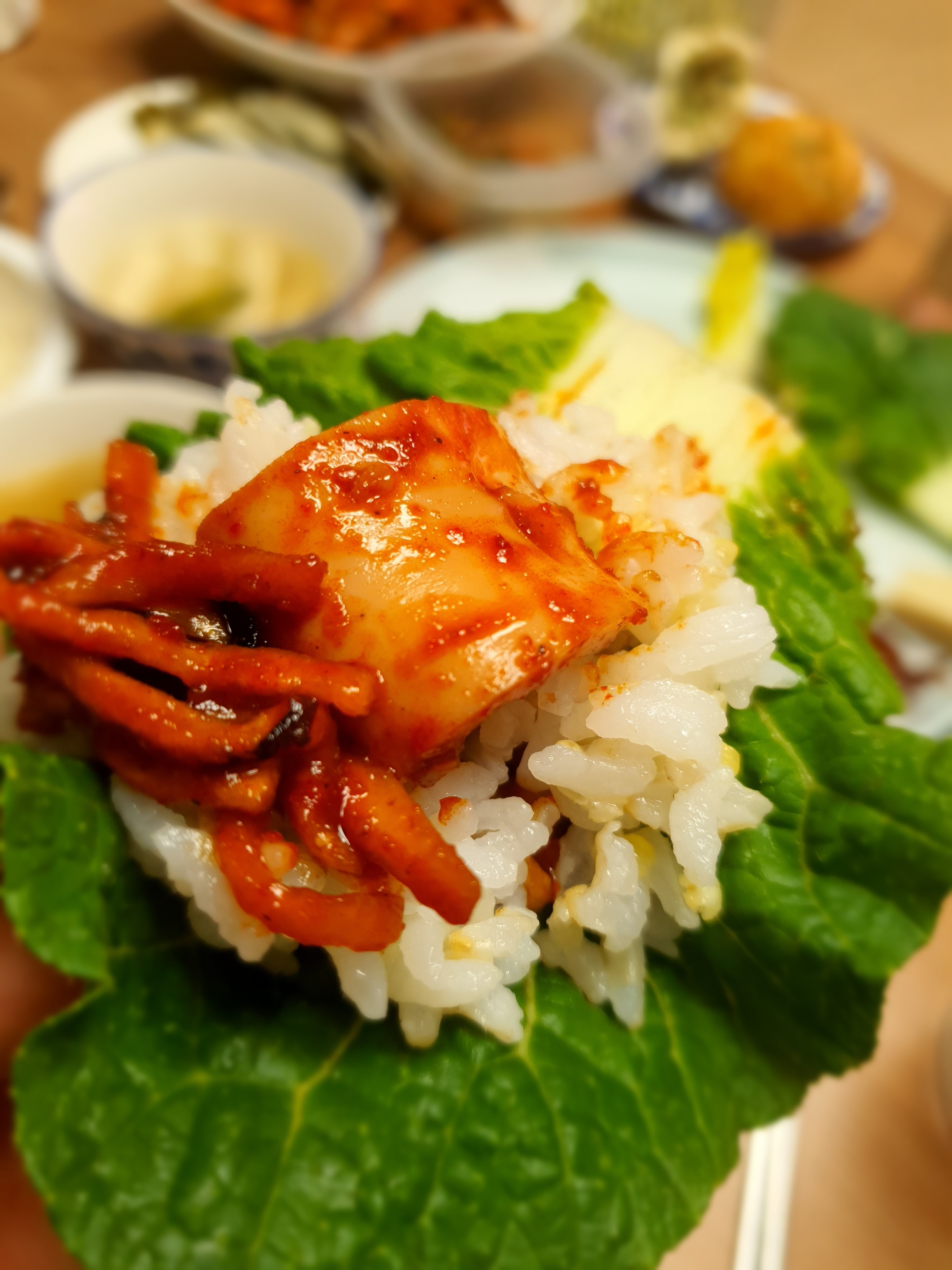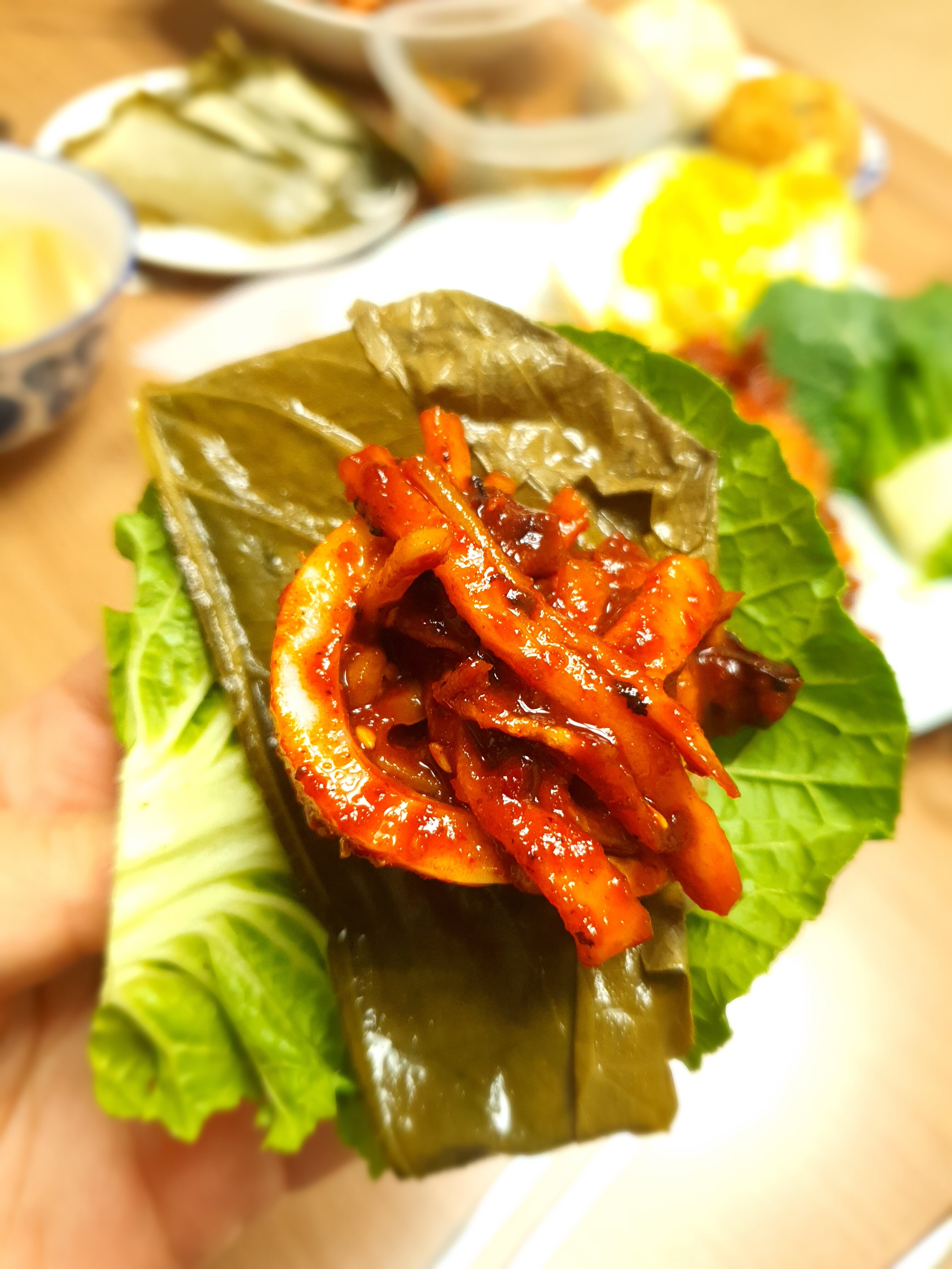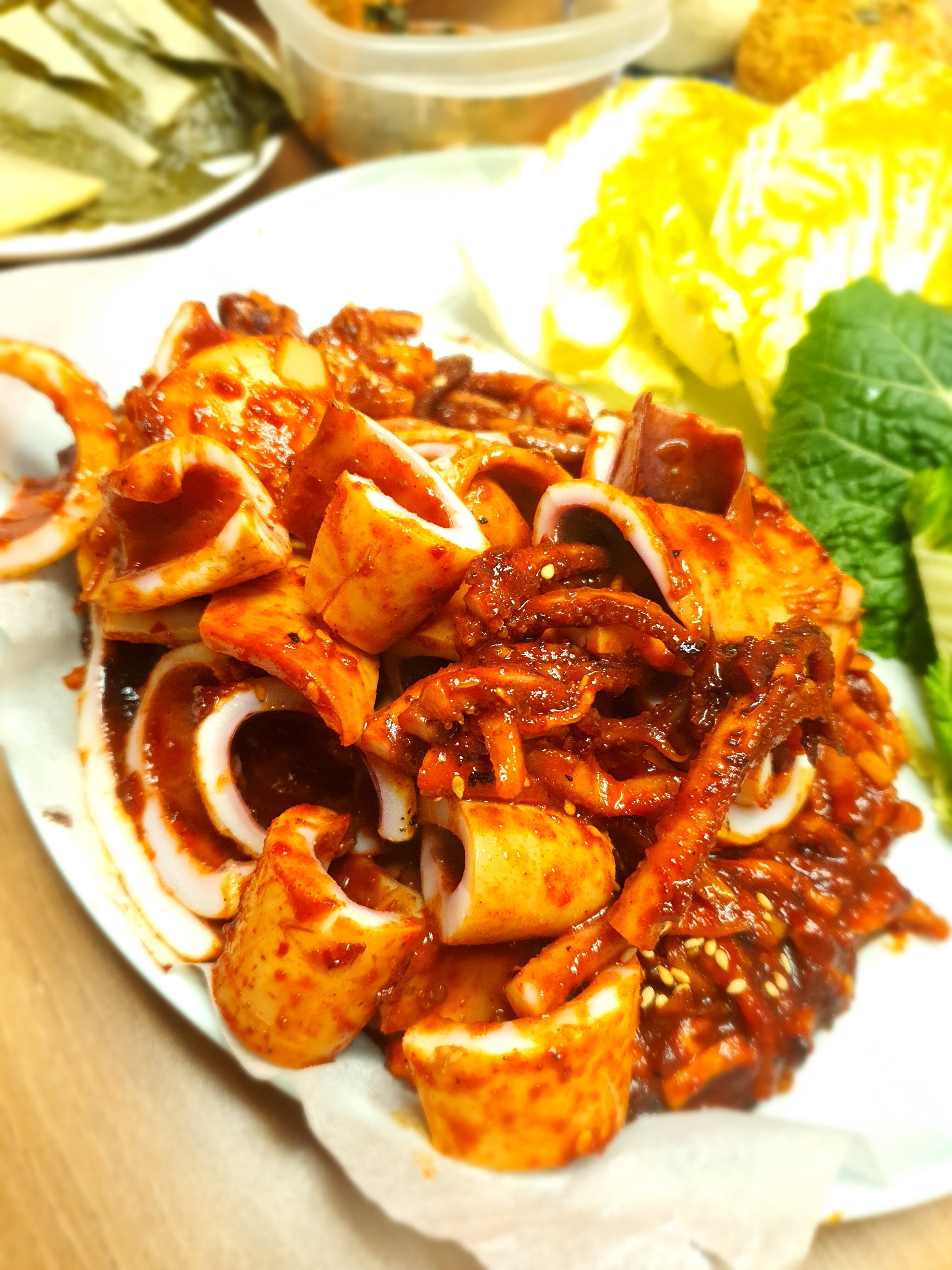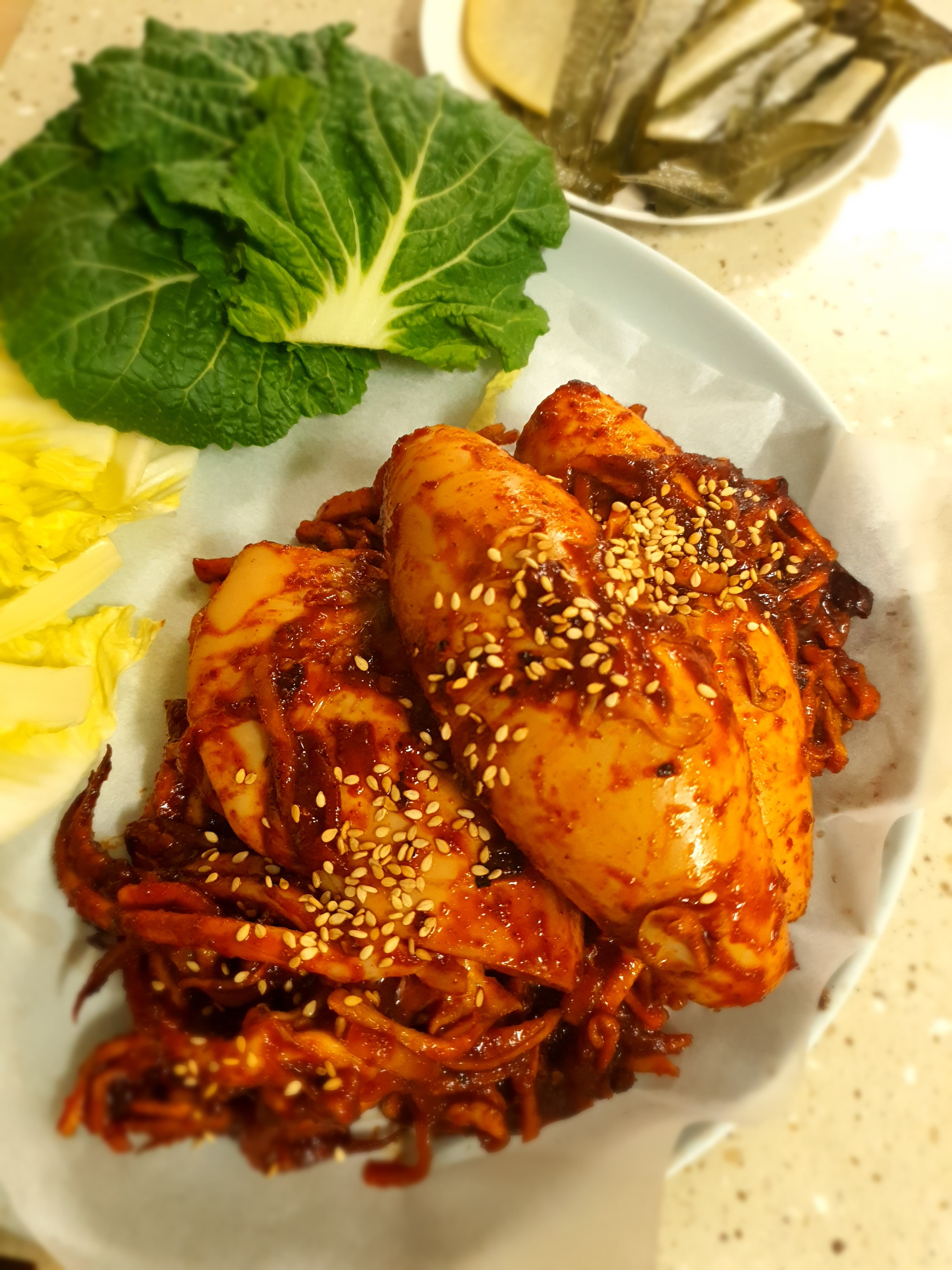 💛 오징어는 통으로 해서 가위로 썰어서 무채와함께 야채나 쌈무에 싸먹어야함