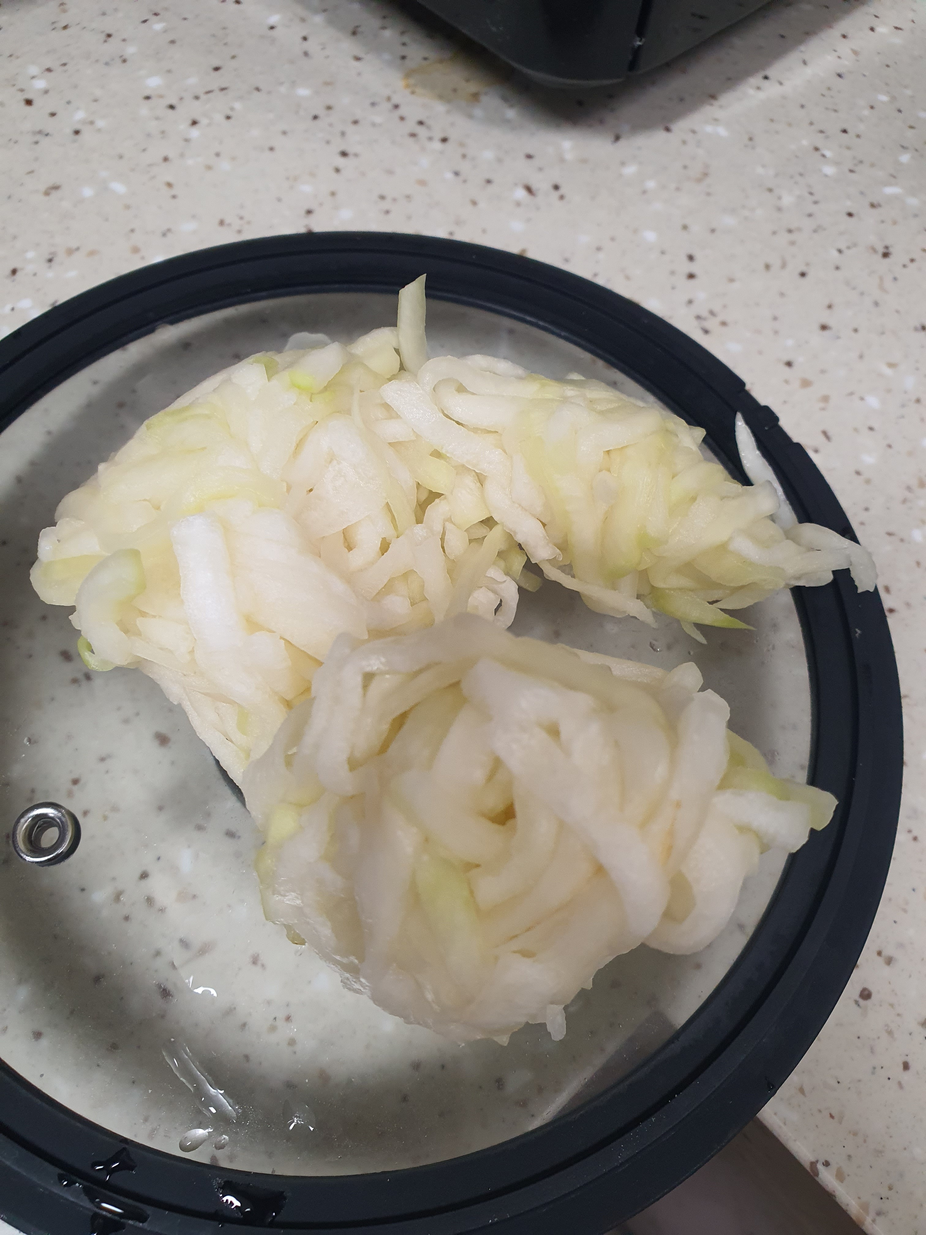 8. 꽉짜준 무채 대기시키고 후라이팬에 설탕뿌리기