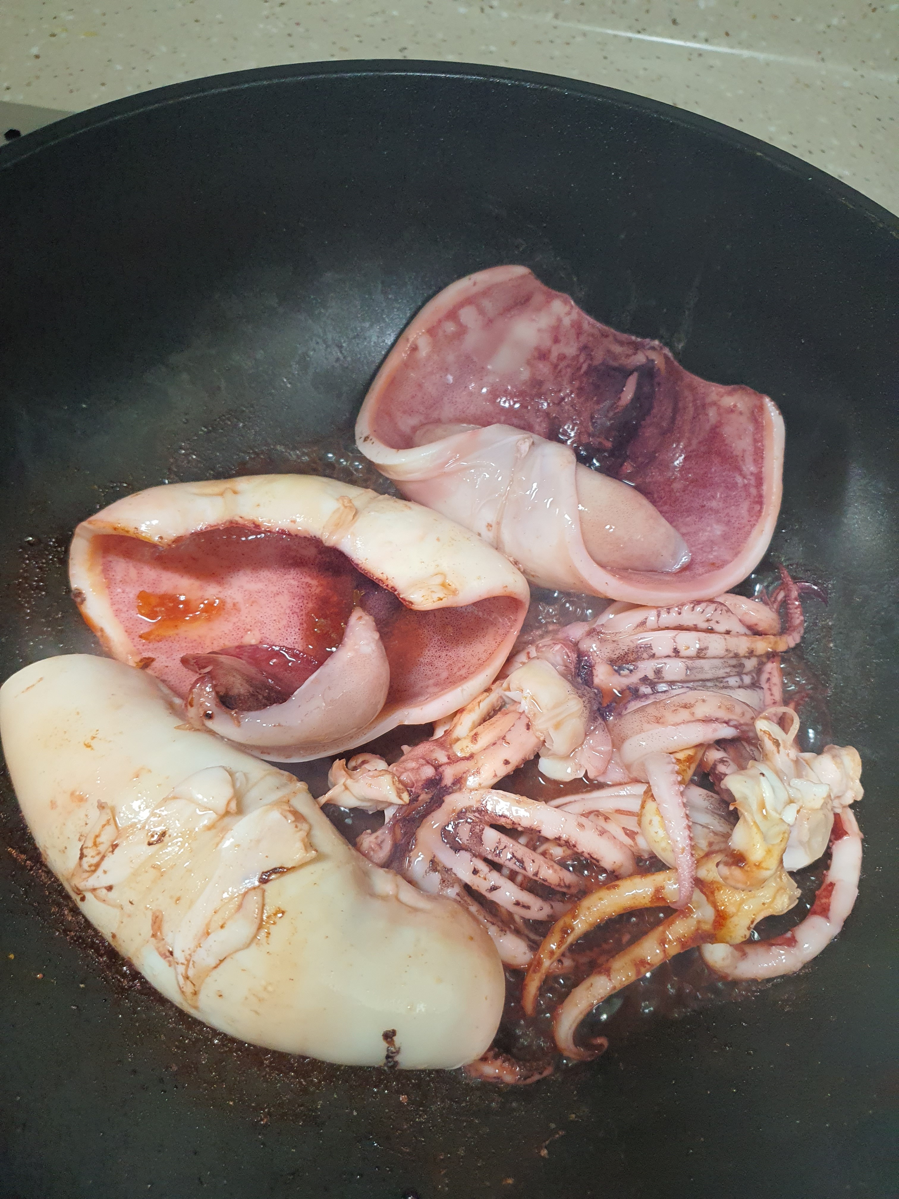 9. 약불로 살짝 설탕 녹은거거든 그럼 오징어넣고 굽기