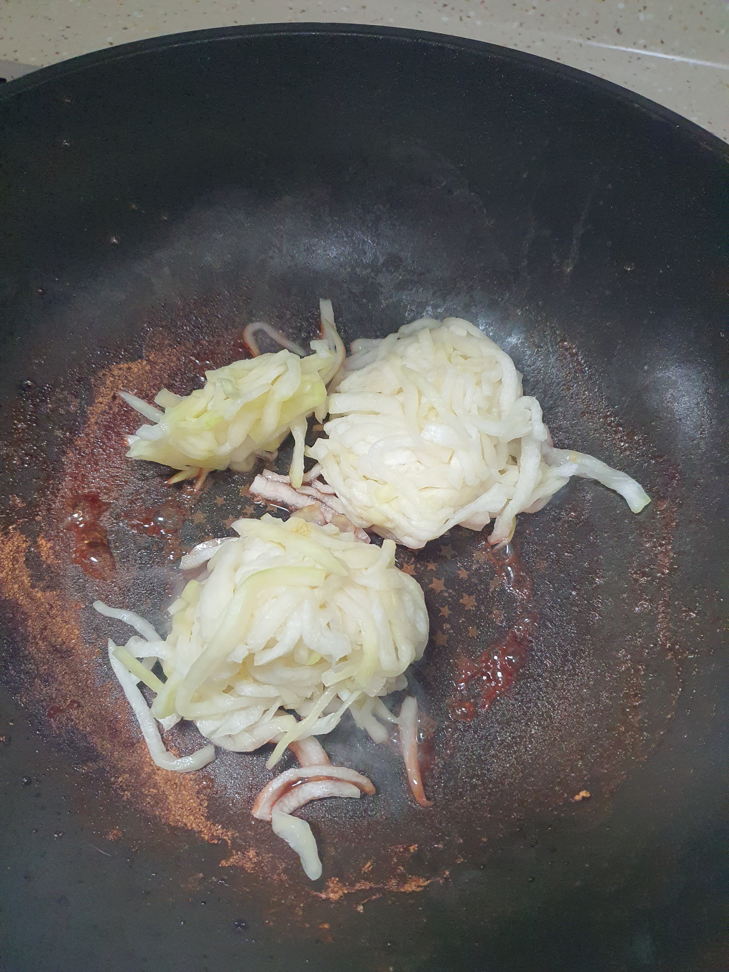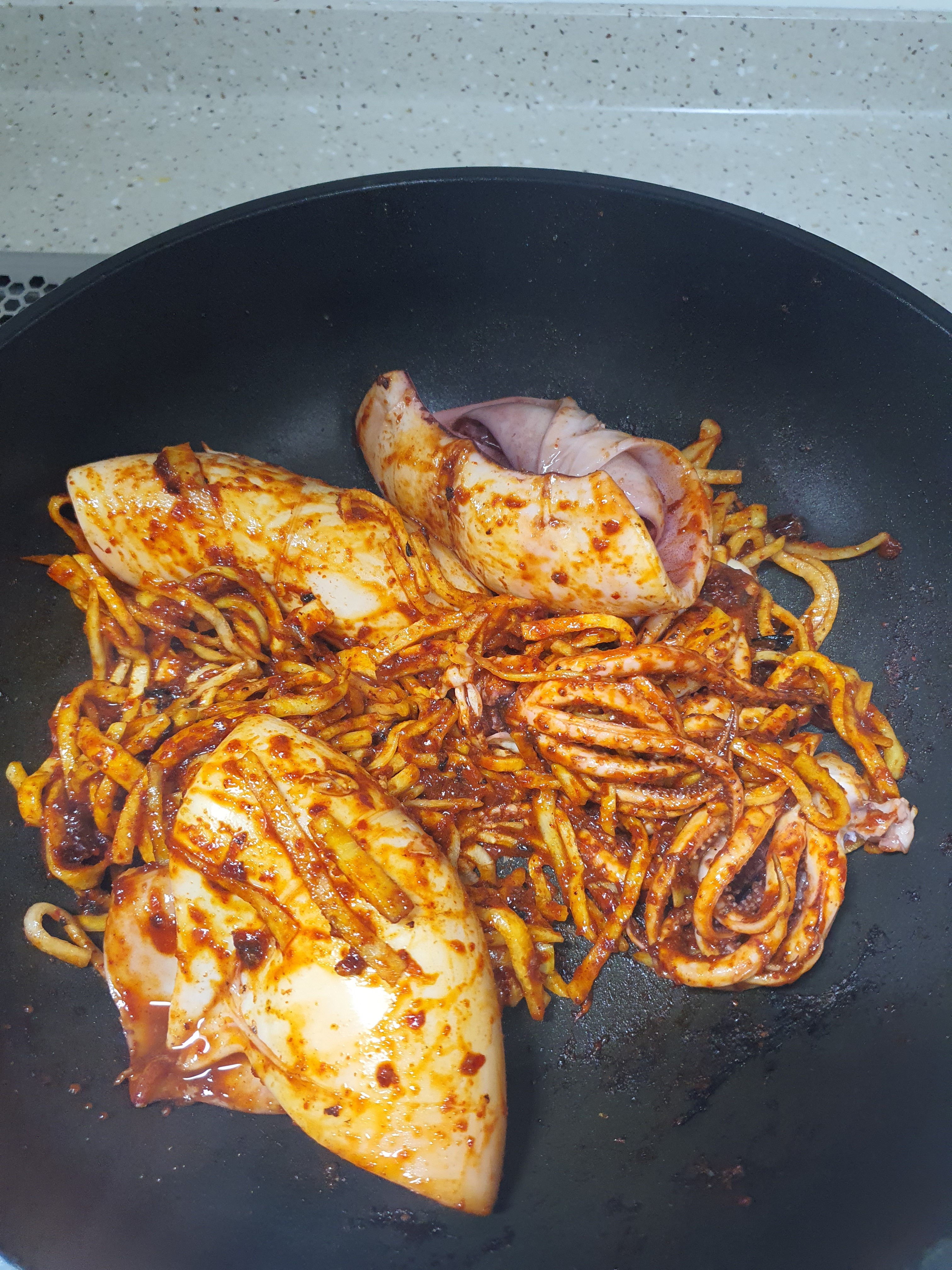 12. 그대로 오징어 꾸운 팬에 무채 넣고 볶음양념장 준비