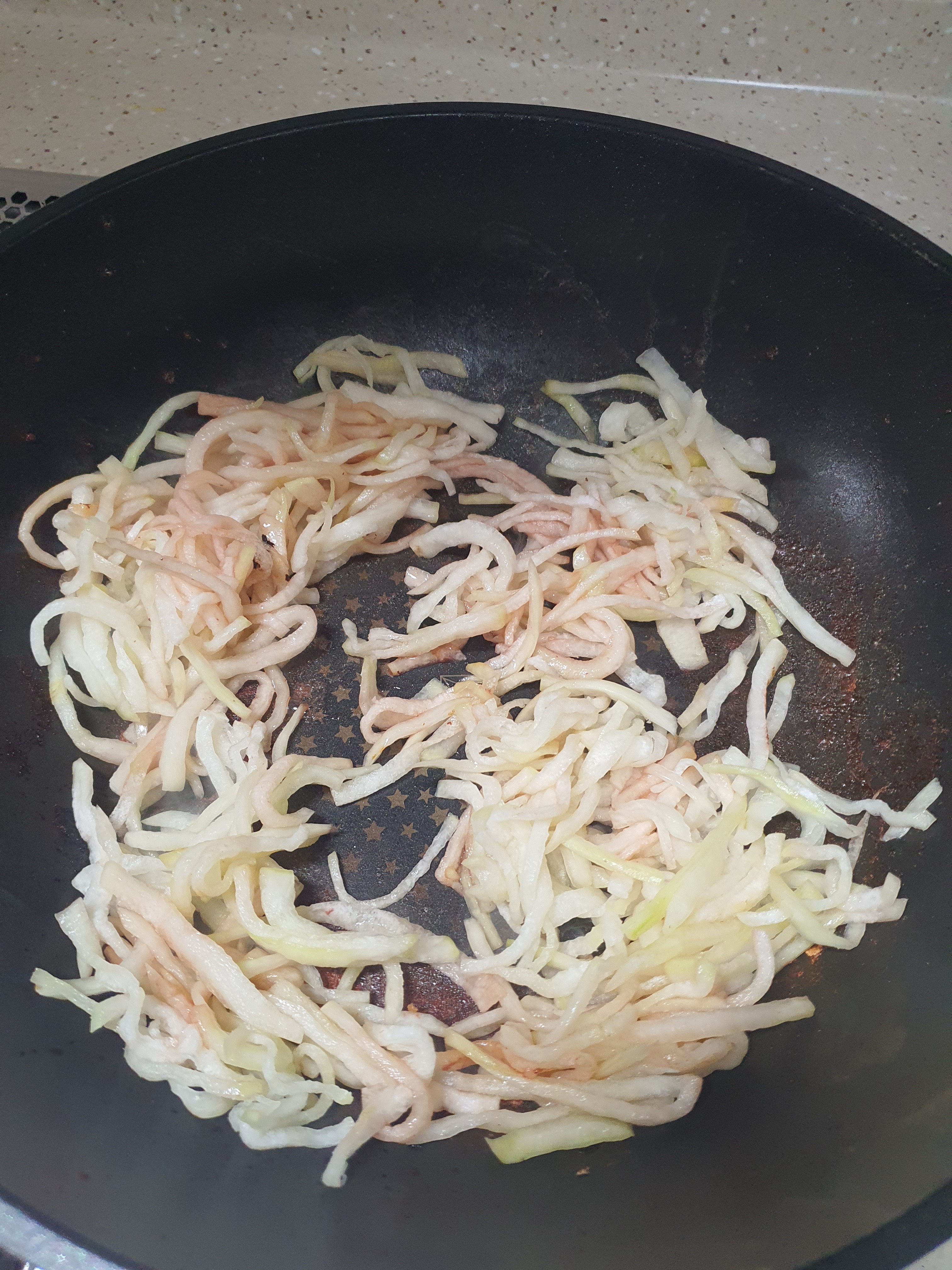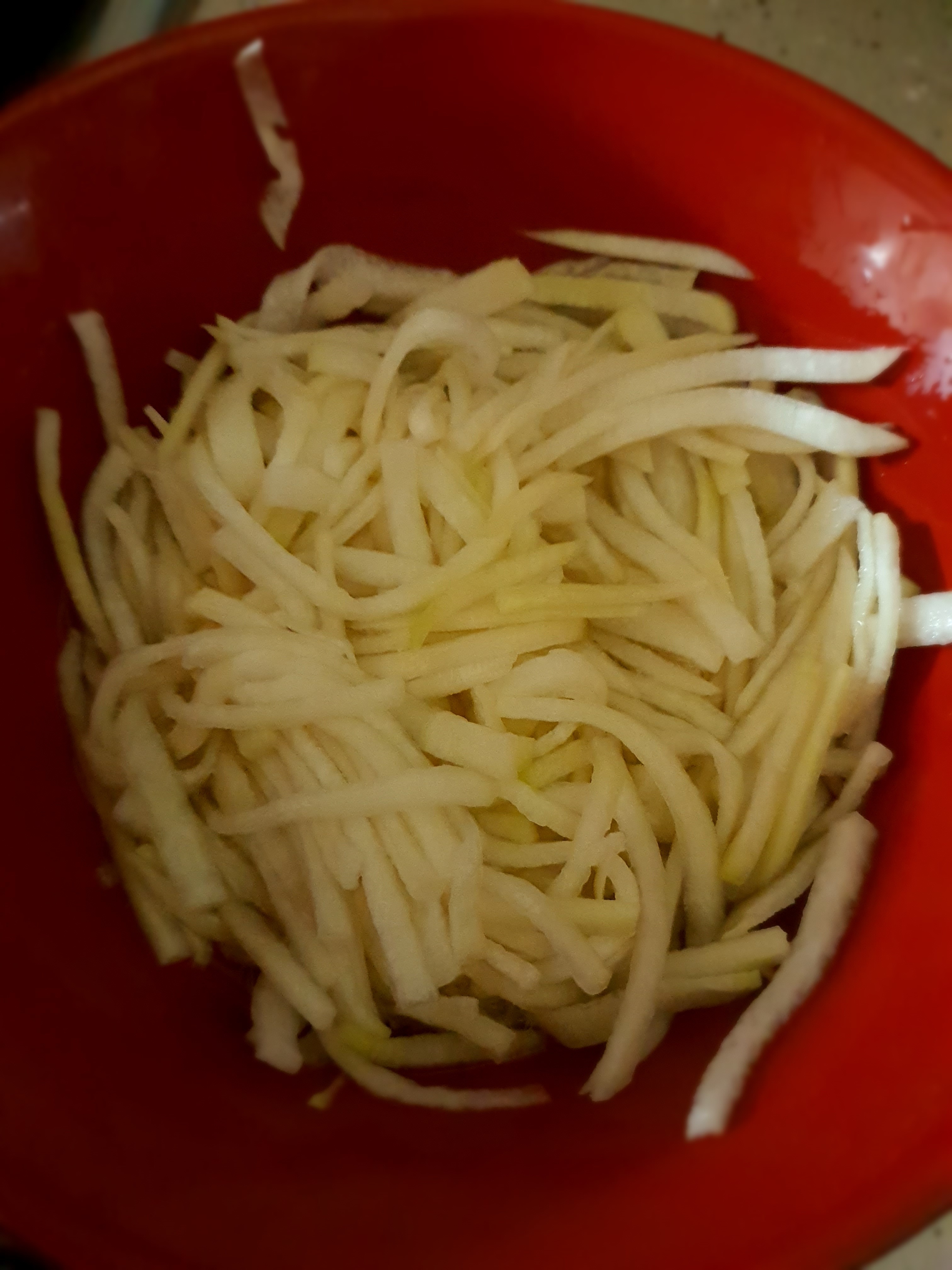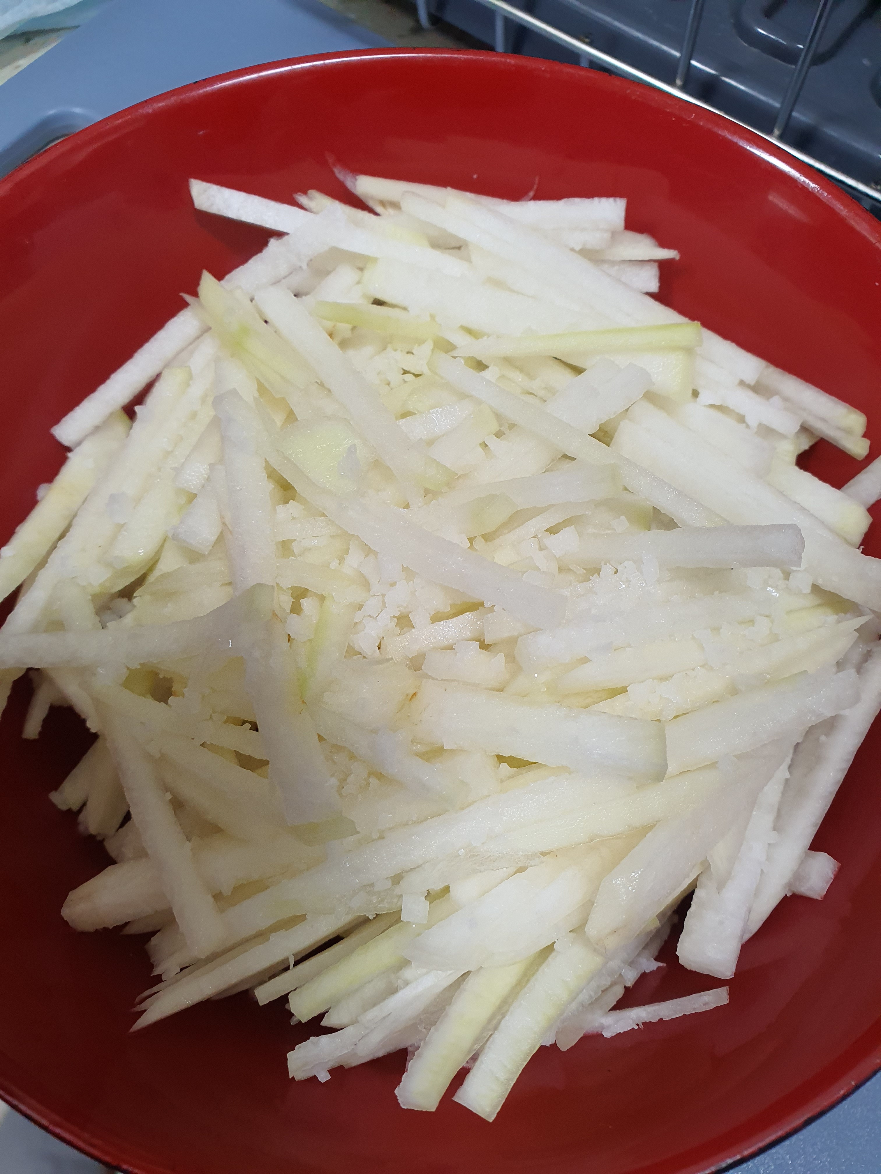 (너무 얇게하면 안돼요, 무가 어차피 절이고 볶는과정에서 줄어드니 두껍게 채썰기)