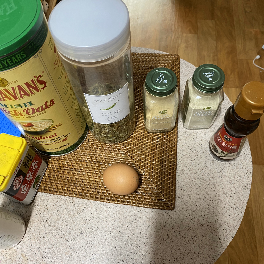 준비물 : 오트밀, 말린 청양고추, 마늘가루, 양파가루, 참기름, 후추, 소금, 계란, 들깨가루 그리고...