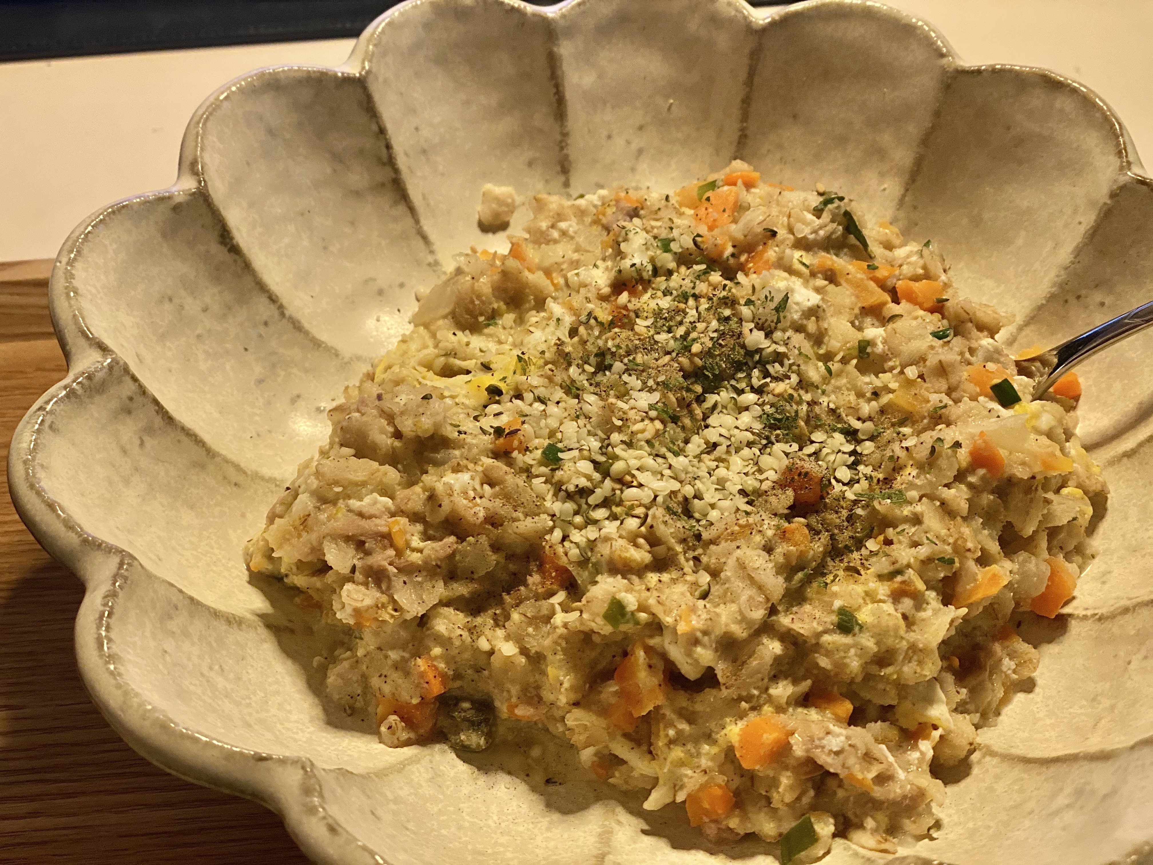 칼로리는 오트밀45g(140kcal) + 마일드참치(65kcal) + 계란 (75kcal) = 280kcal 내외..