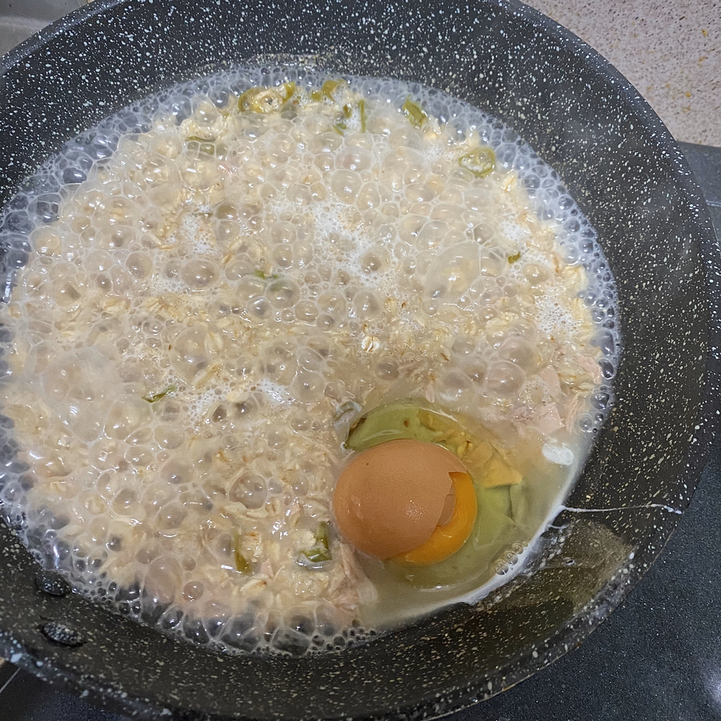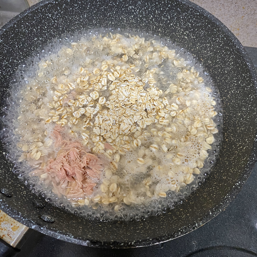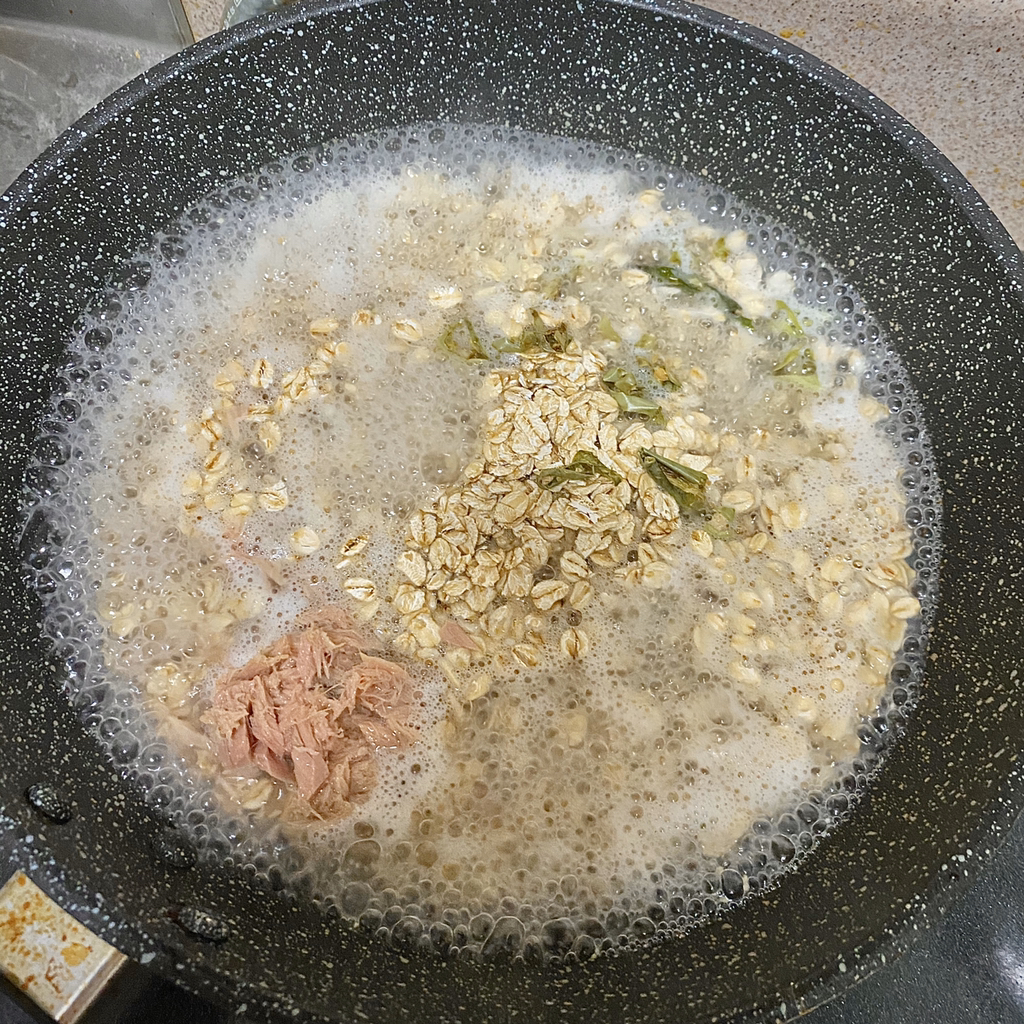 어느정도 끓었으면 오트밀3스쿱(=45g) 마일드참치 반캔 넣어
