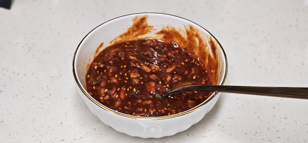 -고추장 2, 진간장 2, 설탕 2, 식초 2~3, 맛술 1, 다진마늘 1.5, 다진파 1, 깨, 김가루, 들기름 2.5