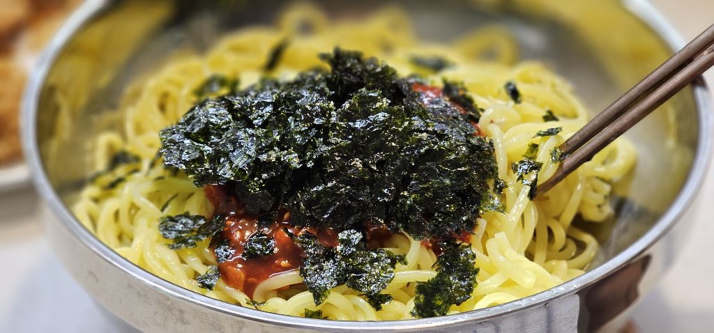 들기름 코팅한 면 위에 양념이랑 김가루 올려