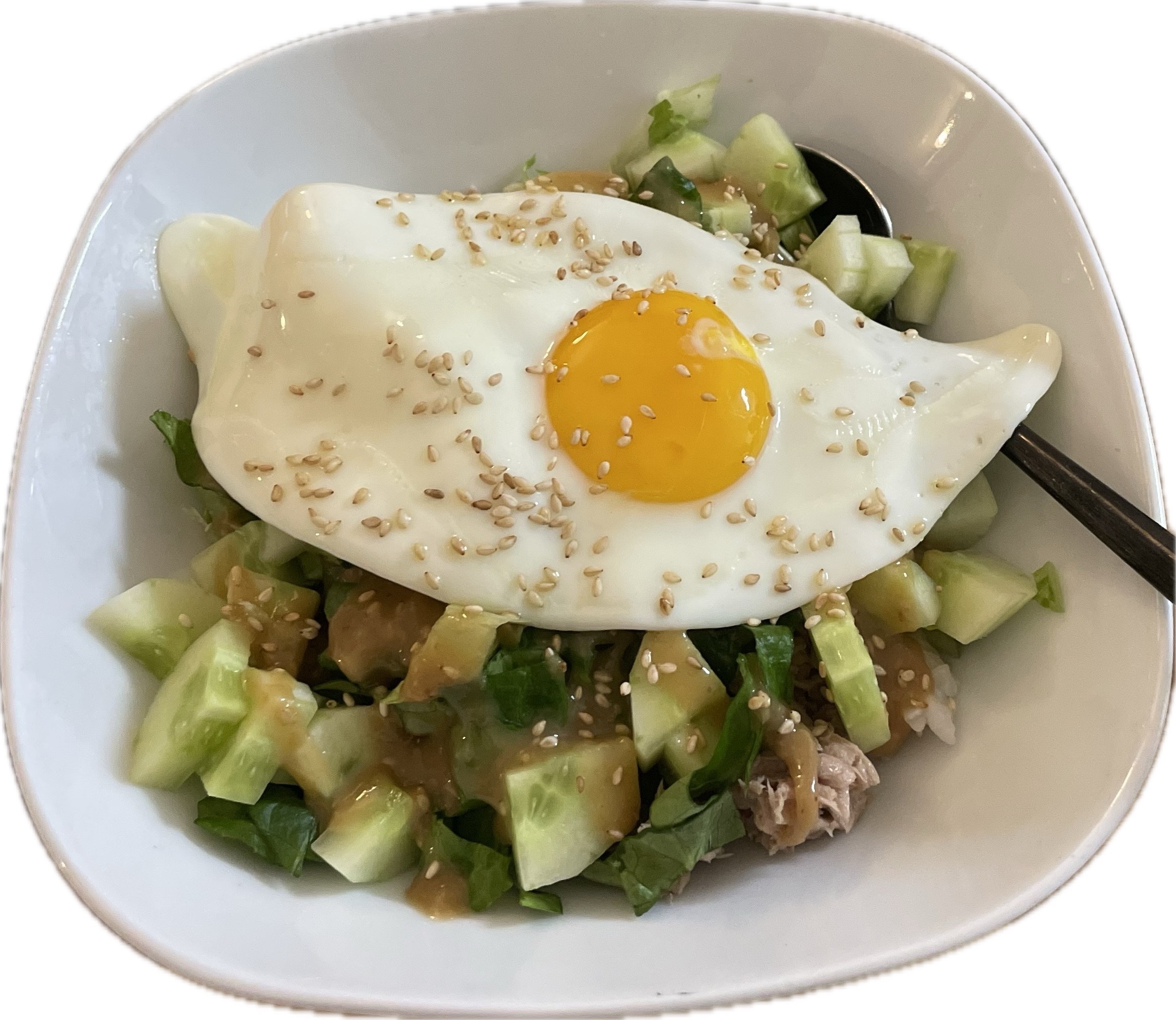 - 반숙겨란후라이로 이쁘게 덮어줘요. 겨란노른자가 소스랑 섞이면서 맛을 다 어우러주는 느낌이라 반숙 추천