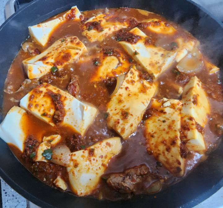 9. 약~중불로 줄이고 열어서 물을 더 부어주고 양념장을 풀어 줌