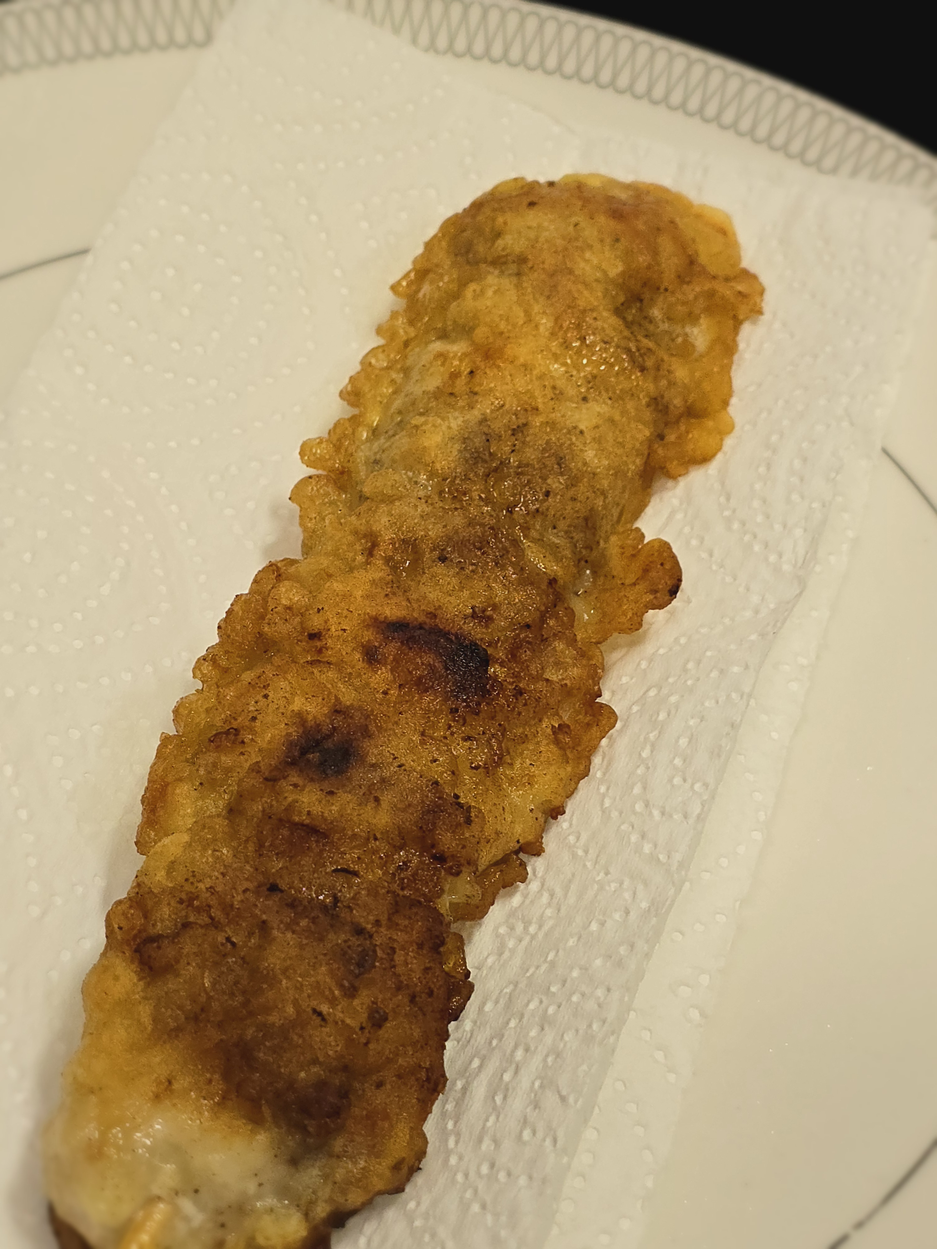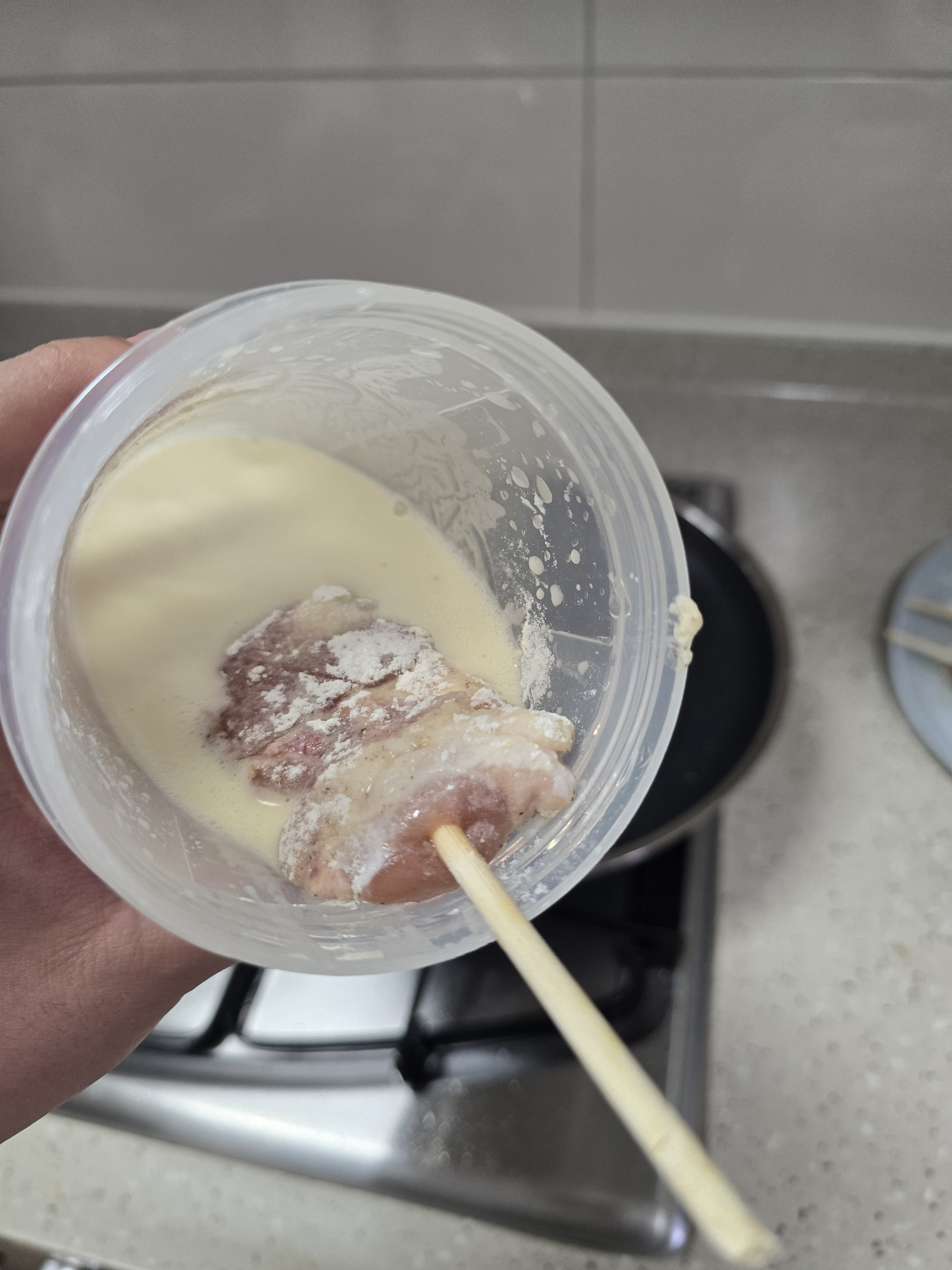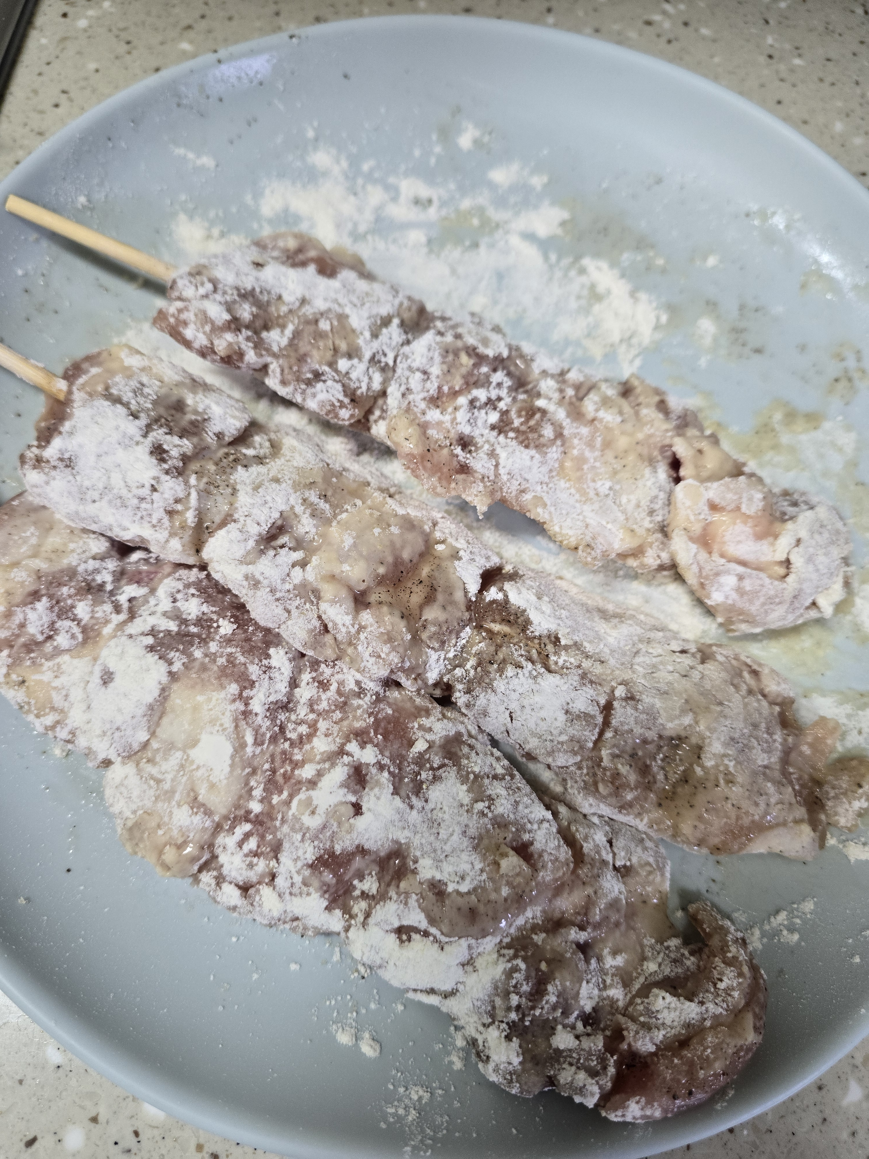 닭다리3꼬치 / 소금후추 / 전분가루 / 튀김가루or부침가루 /