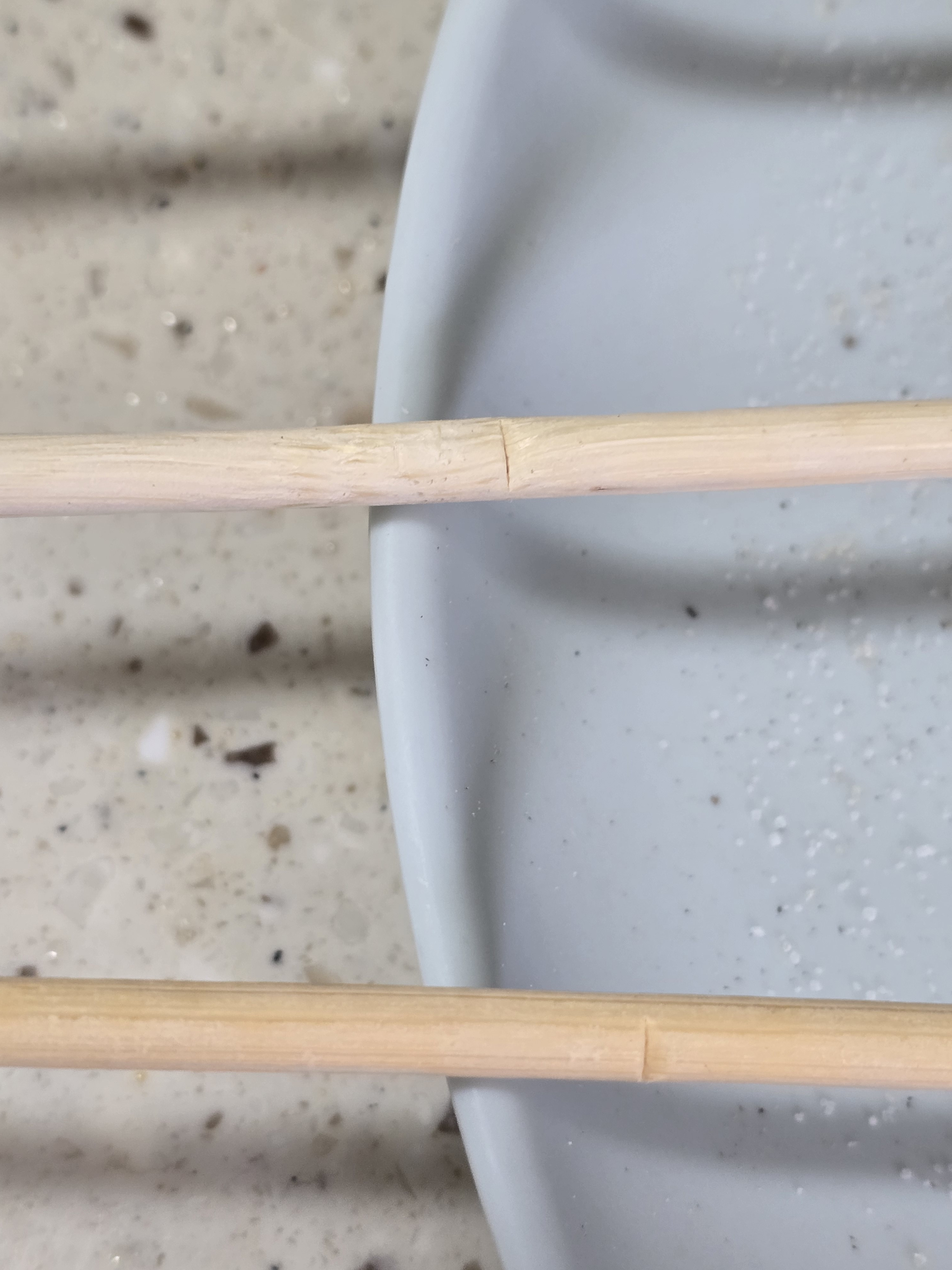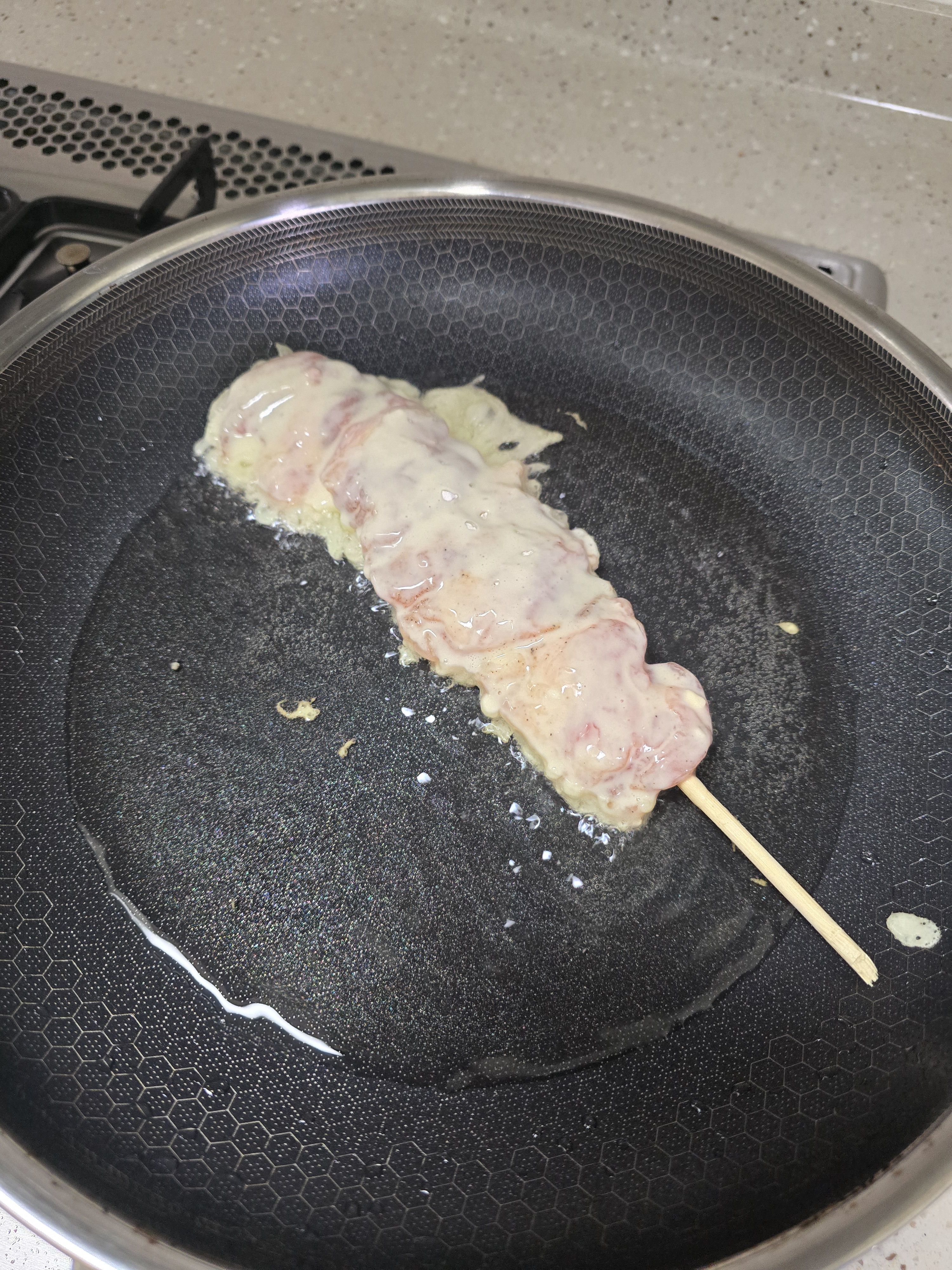 튀겨줄 팬에 맞게 꼬치 잘라주기 (가위로 표시 꽉 내주고 손으로 툭 하면 잘 부러짐)