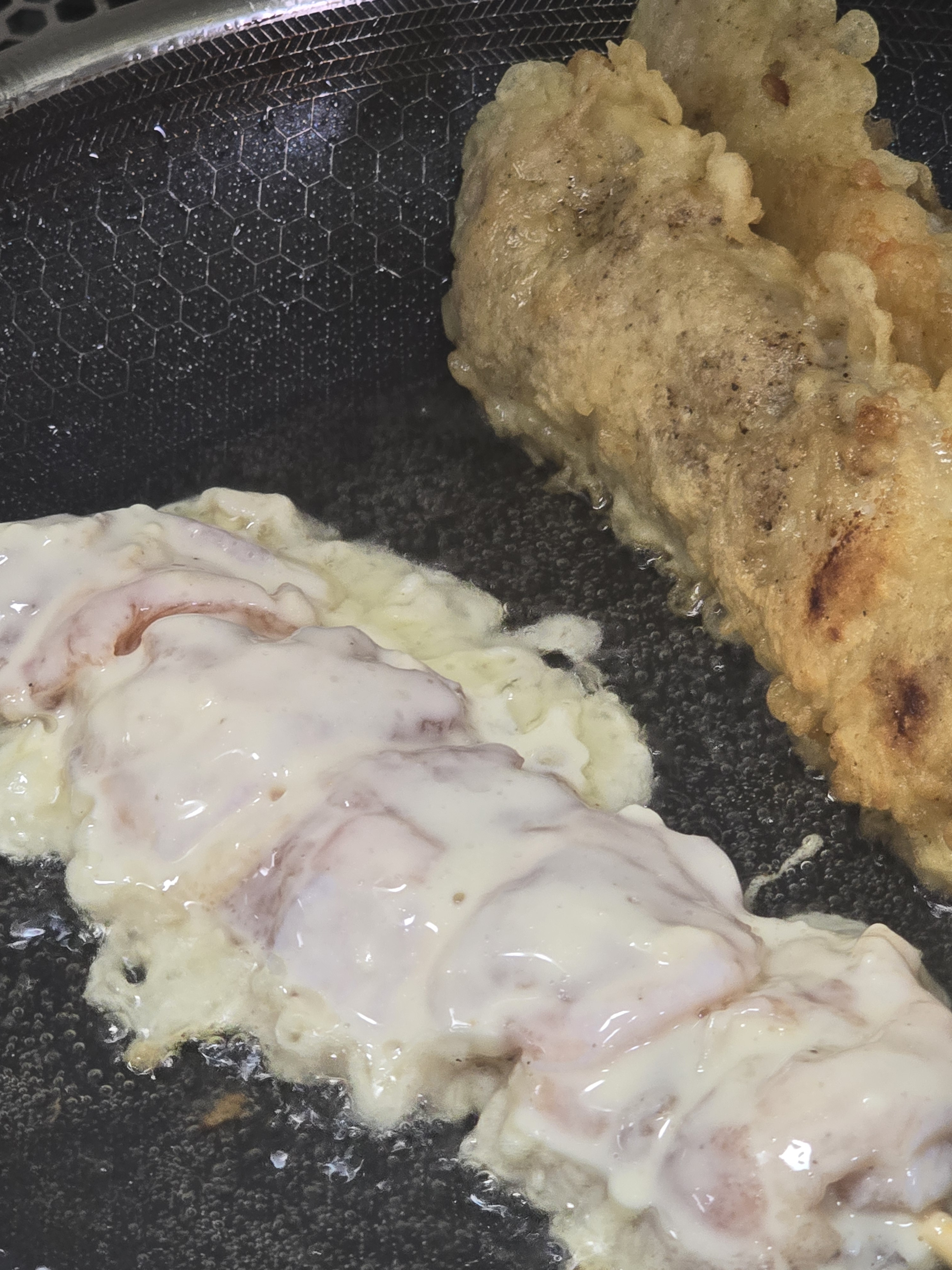 기름예열해주기 (기름을 적게하는거라서 예열 덜된상태에 반죽묽고 오래 안튀겨주면 닭에서 수분도 나와서 바삭하게 절대 안나옴)