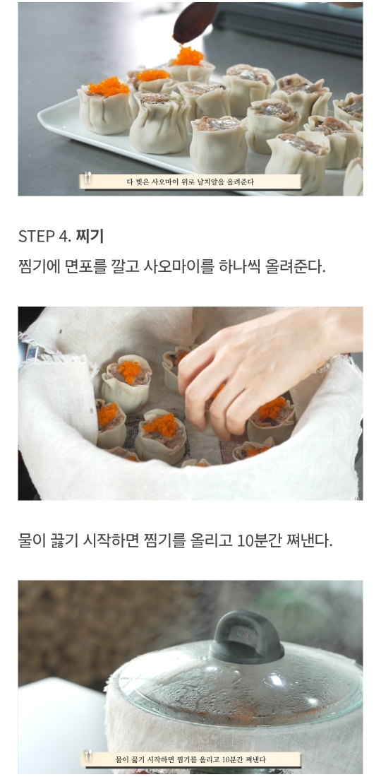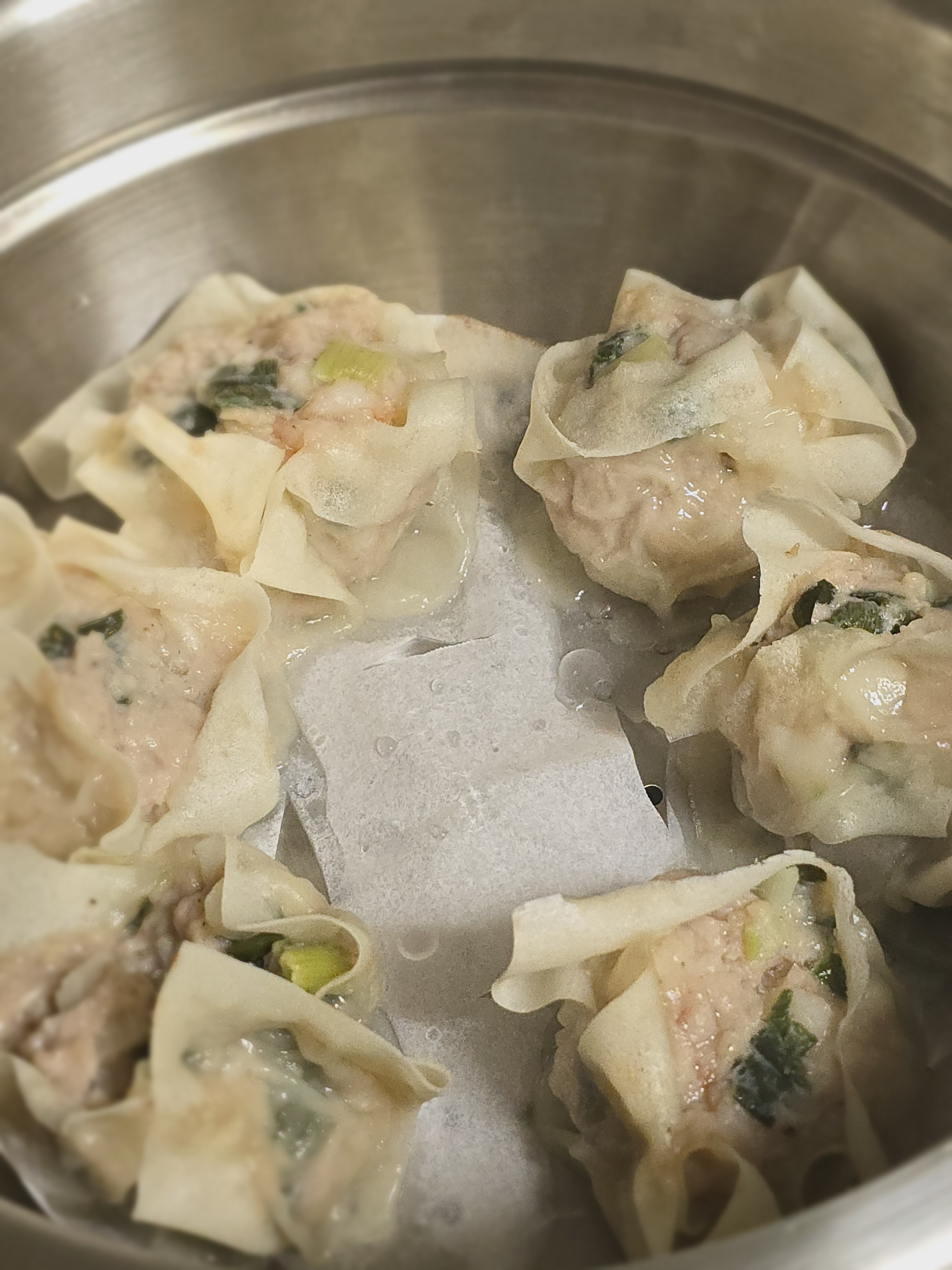 적신 면보를 찜기위에 올리고 물이 끓으면 샤오마이 넣고 쪄 줘