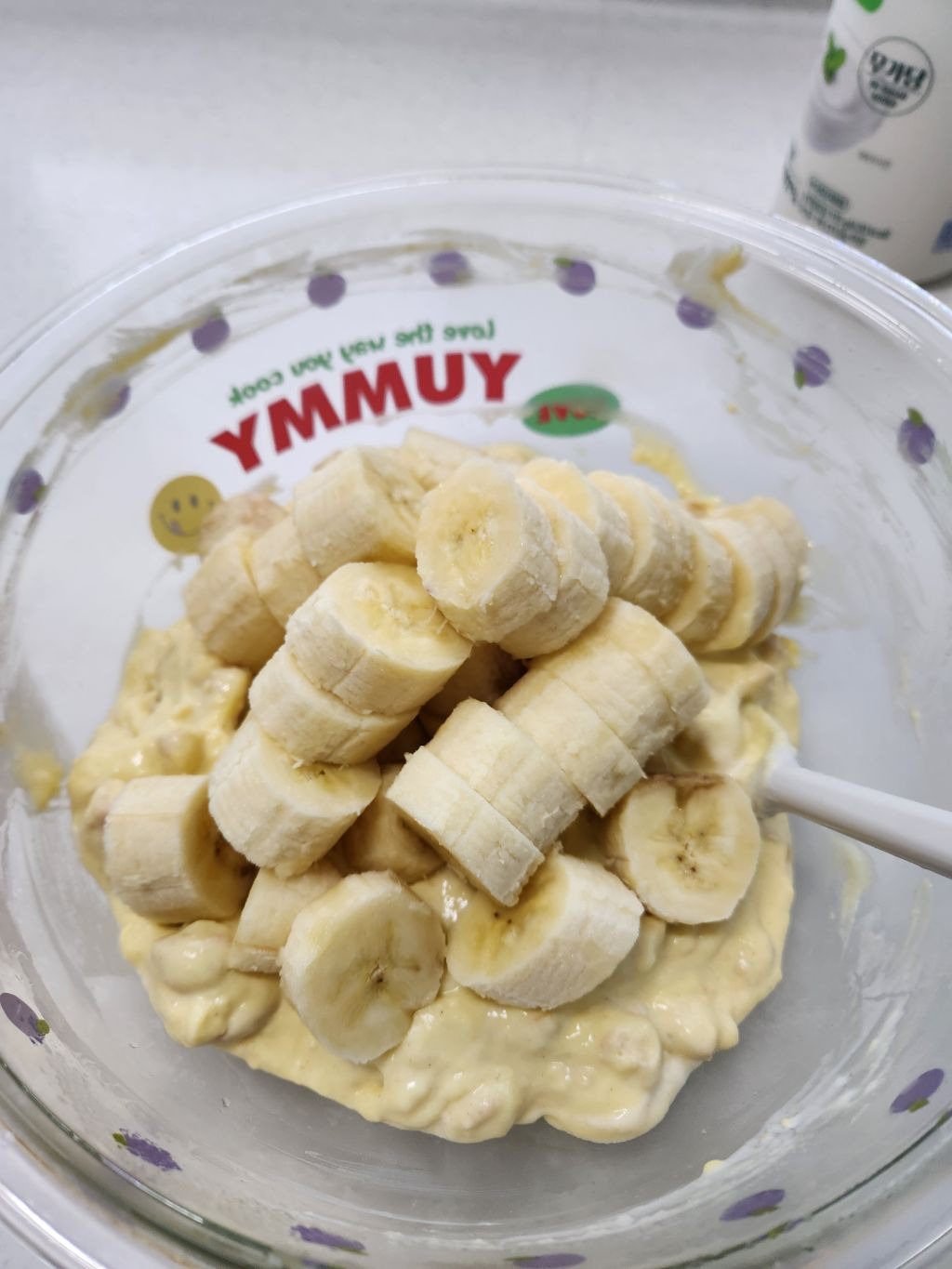 5. 차가운 커스타드 크림에 같은 비율의 플레인 요거트+계란과자+바나나 넣고 섞기!