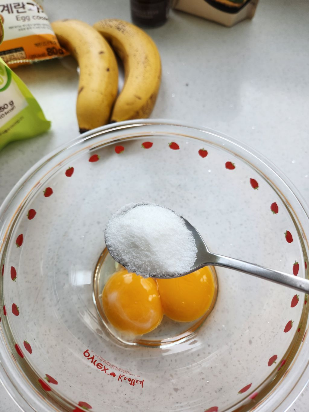 2. 노른자에 설탕 3큰술 넣고 거품기로 잘 풀어줘
