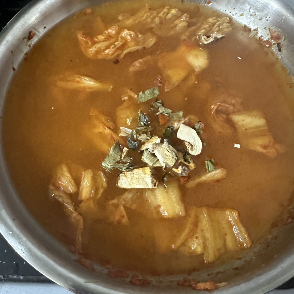 김치 반컵 (국물 재량껏, 익은 김치일수록 맛있다.)