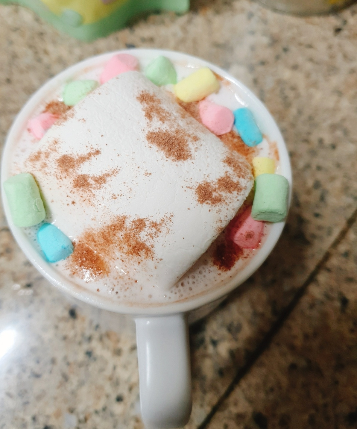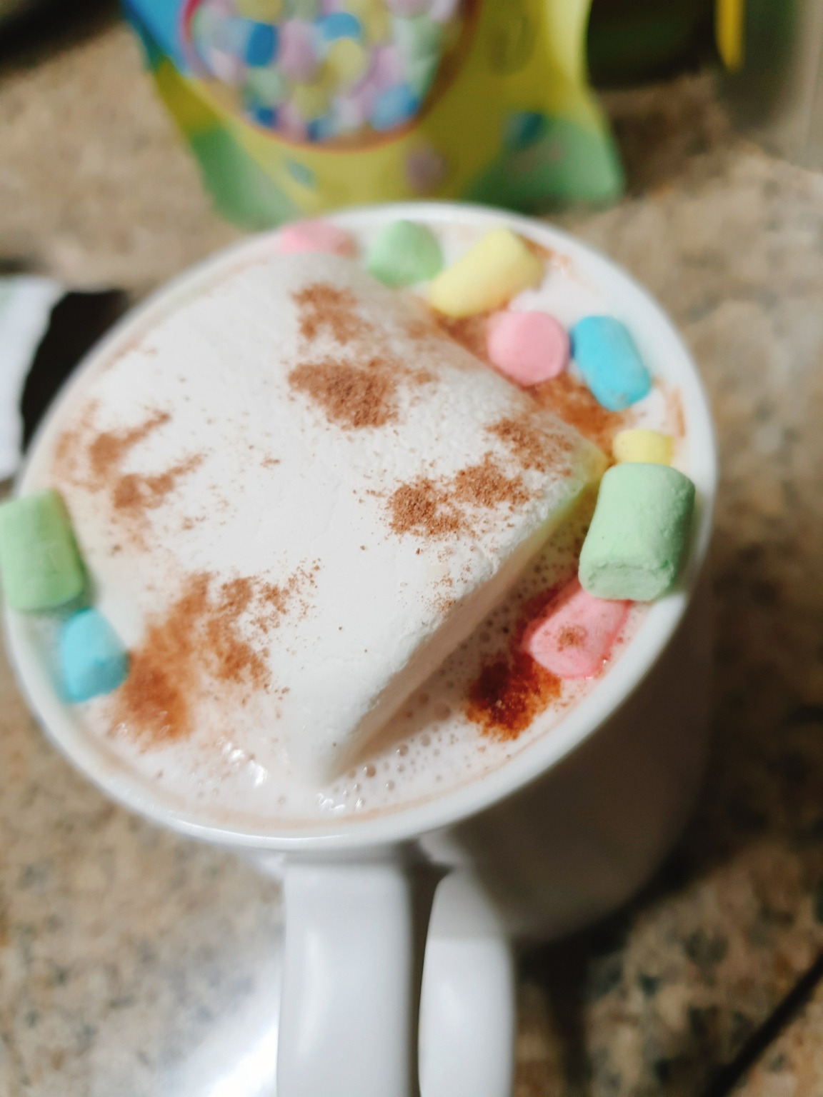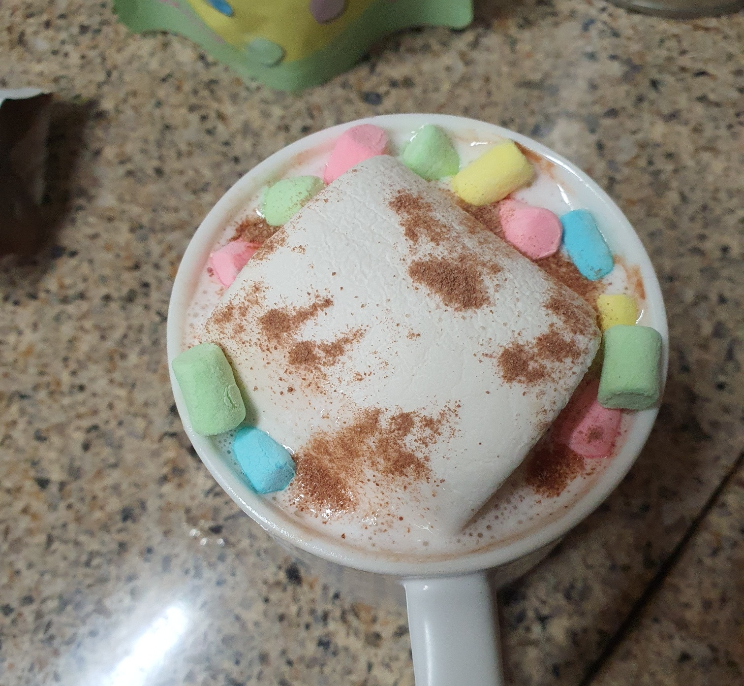 생크림 넣은 후에 부드럽게 풀어지면 그 위에 대왕 마멜을 넣고 짤짤이 시리얼 마시멜로우 넣어줍니다