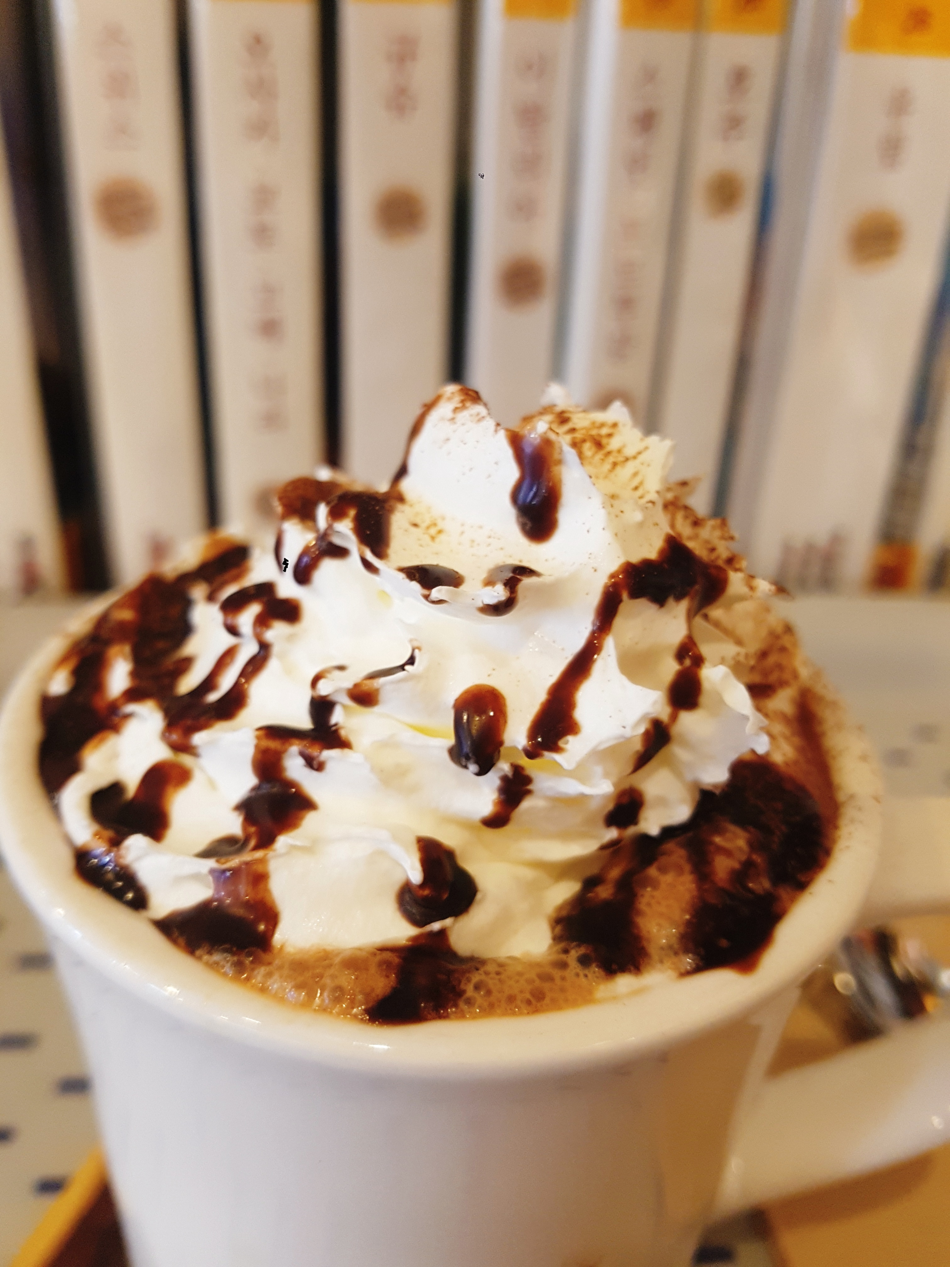 디저트 스푼으로 생크림 듬뿍 떠서 스푼을 그대로 핫초코에 빠뜨리면 생크림이 퐁!하고 핫초코 위로 올라오고 알아서 저렇게 부드럽게 풀어집니다