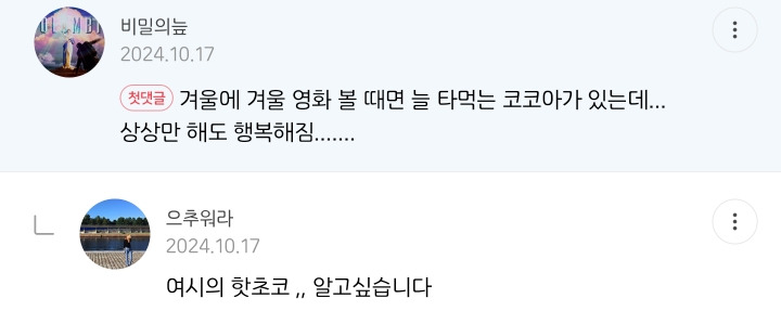 작성자만득이곱창 작성시간 24.11.27 크리스마스분위기에 코코아마시면 딱 좋겠다
