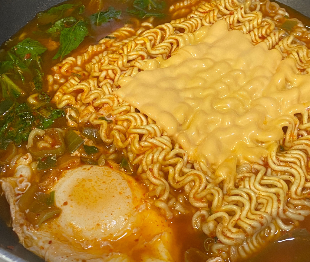 열라면, 계란, 치즈, 고춧가루, 파, 올리브오일(기름), 야채(선택)