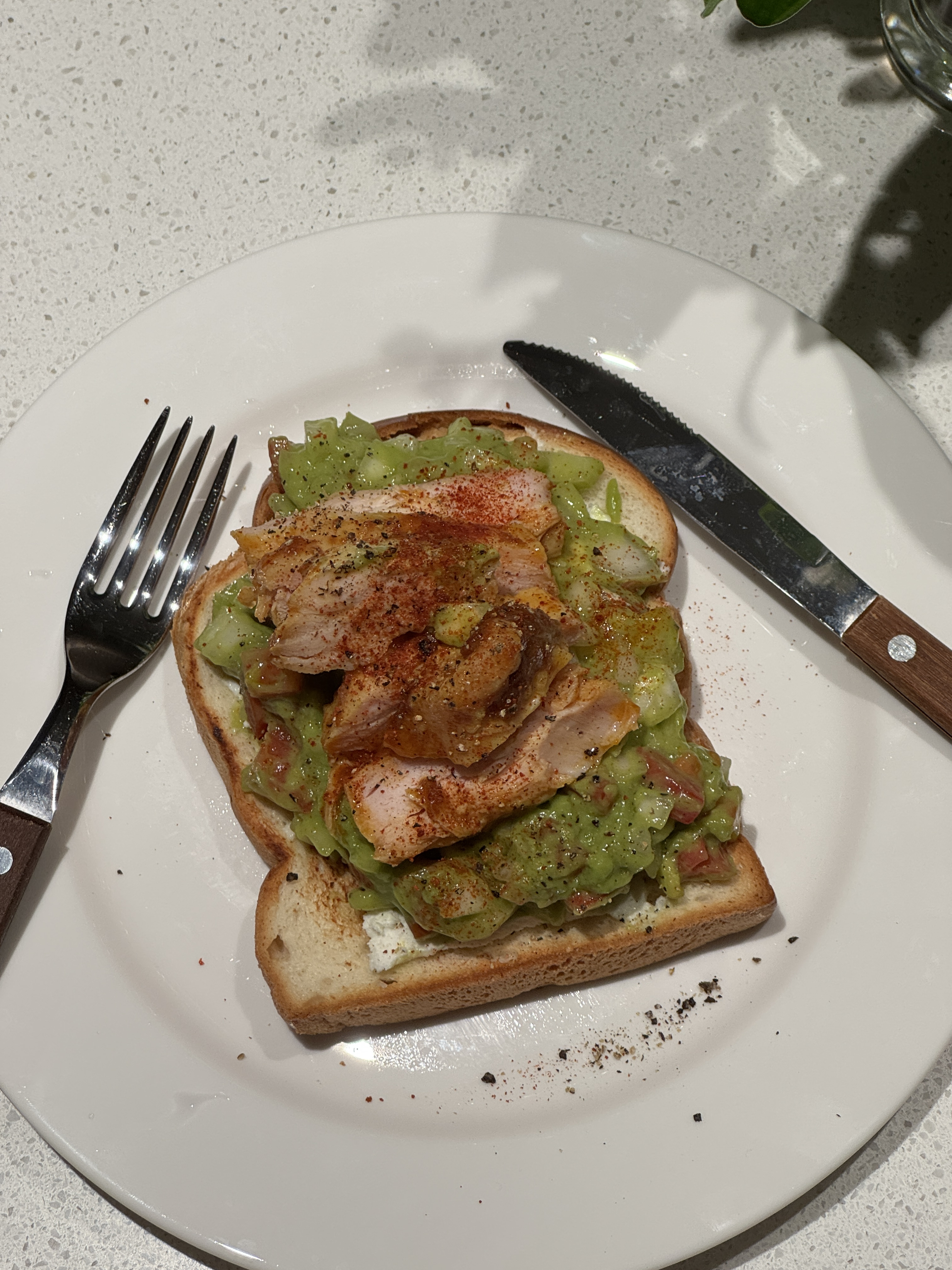 4. 구운 빵에 리코타치즈-과카몰리-닭가슴살 또는 구운 새우 얹어줌. 이때 리코타치즈는 꾸덕한 그릭요거트로 바꿔도 ㄱㅊ