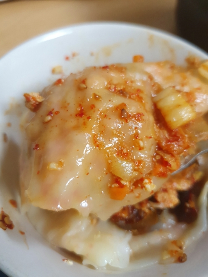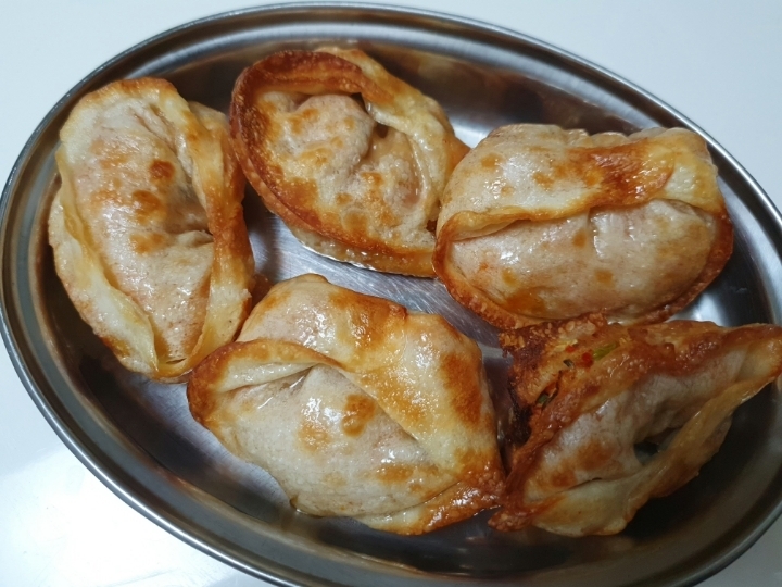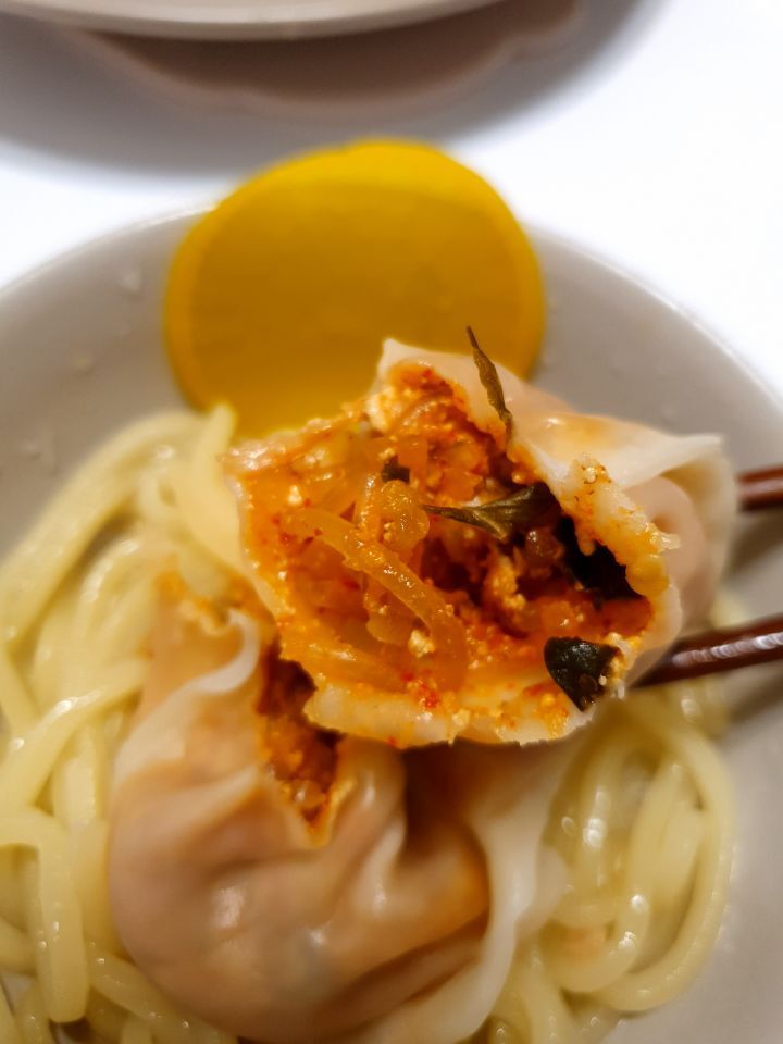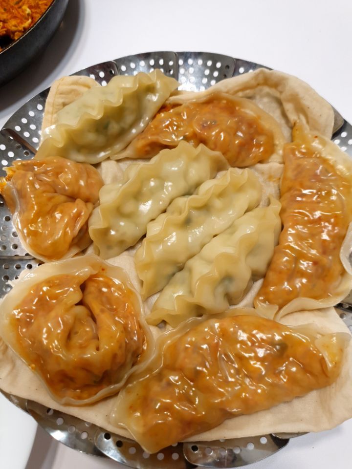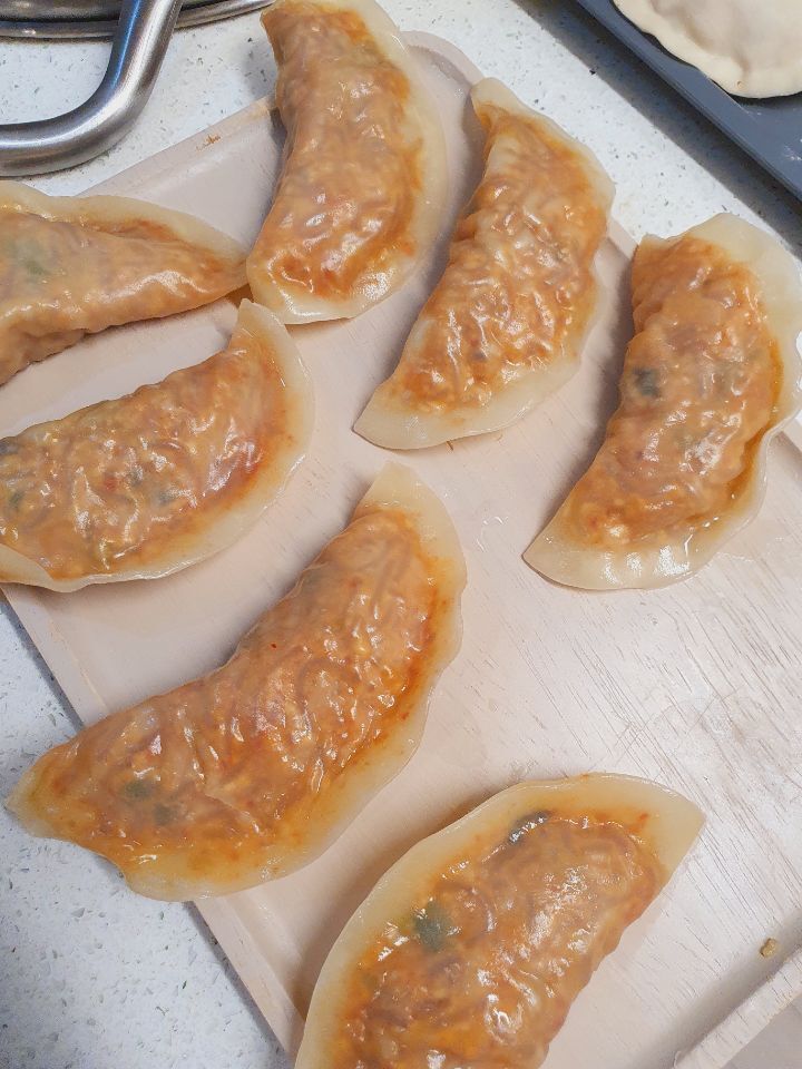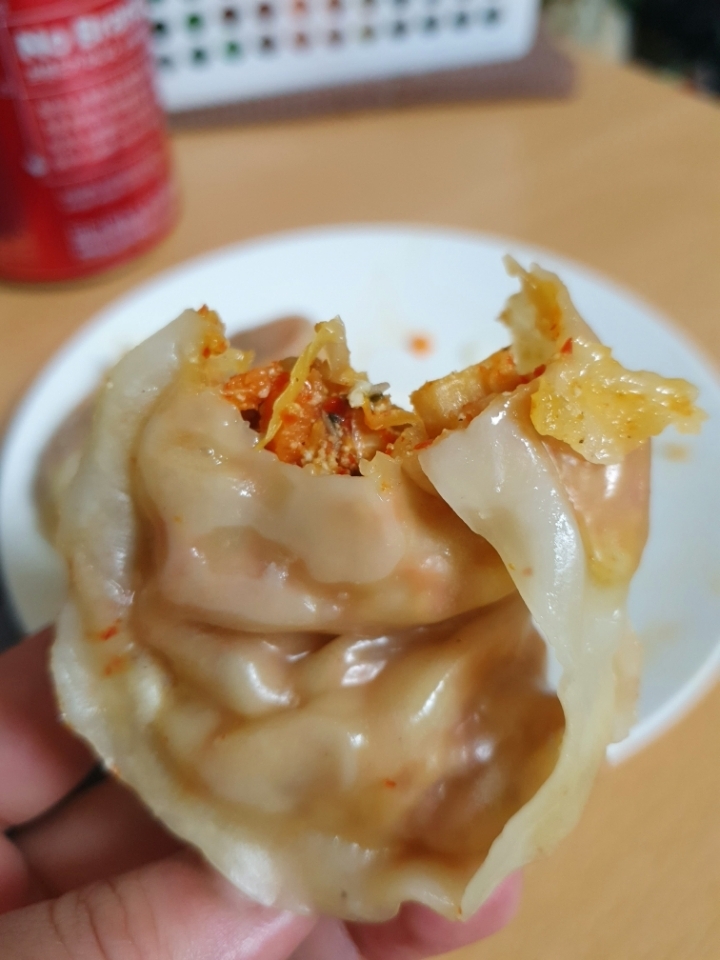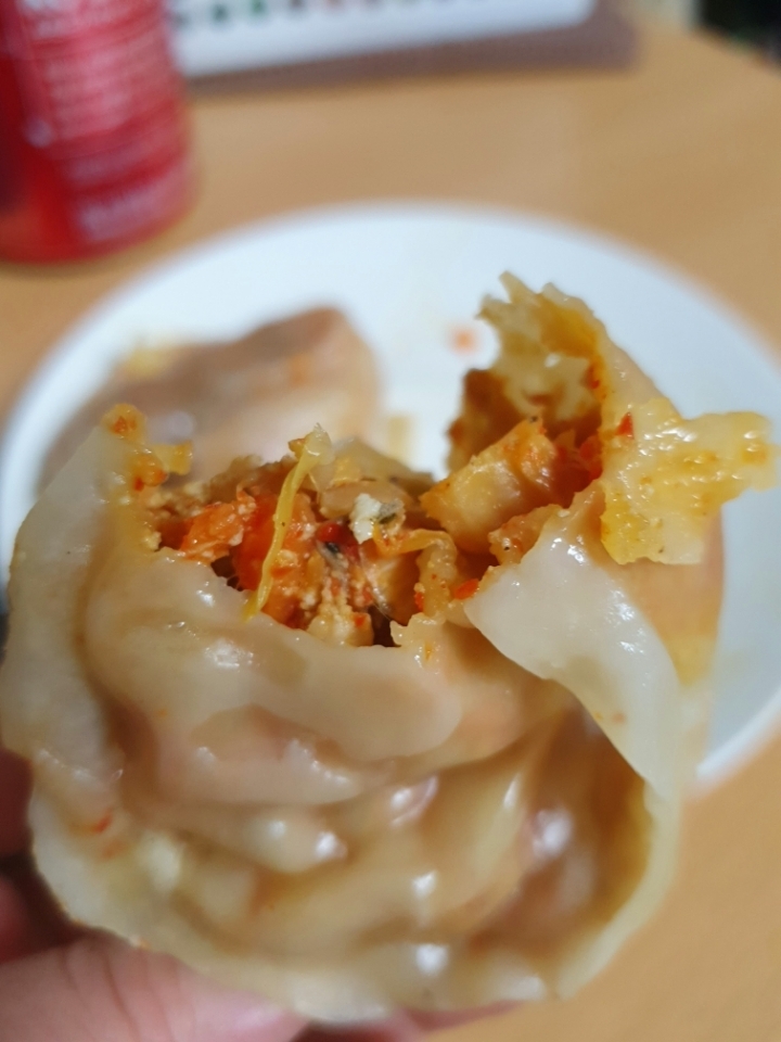 뜨거울때 호호~ 불며 매콤한 김치만두 먹기