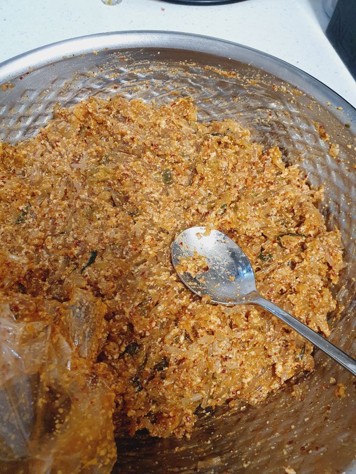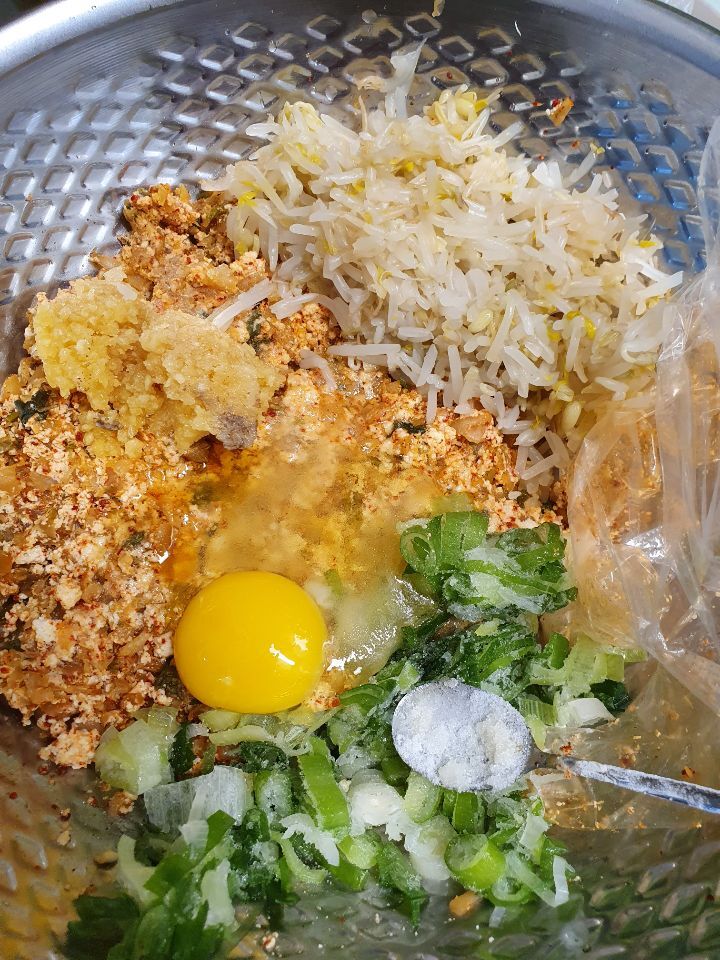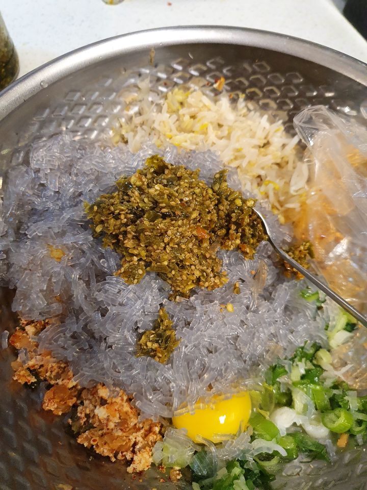 6. 대파 다진김치 달걀한알 으깬두부 다진마늘 듬뿍 2티스푼 숙주 당면 졸여서식혀둔고기볶음