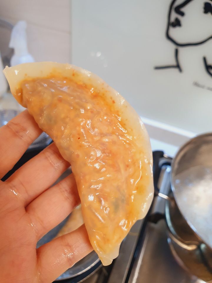 ( 가장자리 만두피가 투명하게 익고 만두속이 살짝 비치면서 말랑말랑 전체적으로 촉촉해 보이는 그 정도)