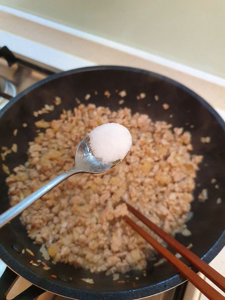 4. 돼지고기를 덩어리지지않게 풀어주며 중불로 볶아주고 겉면이 다 익으면 다져놓은 무를 넣고 2분정도 볶아줍니다.