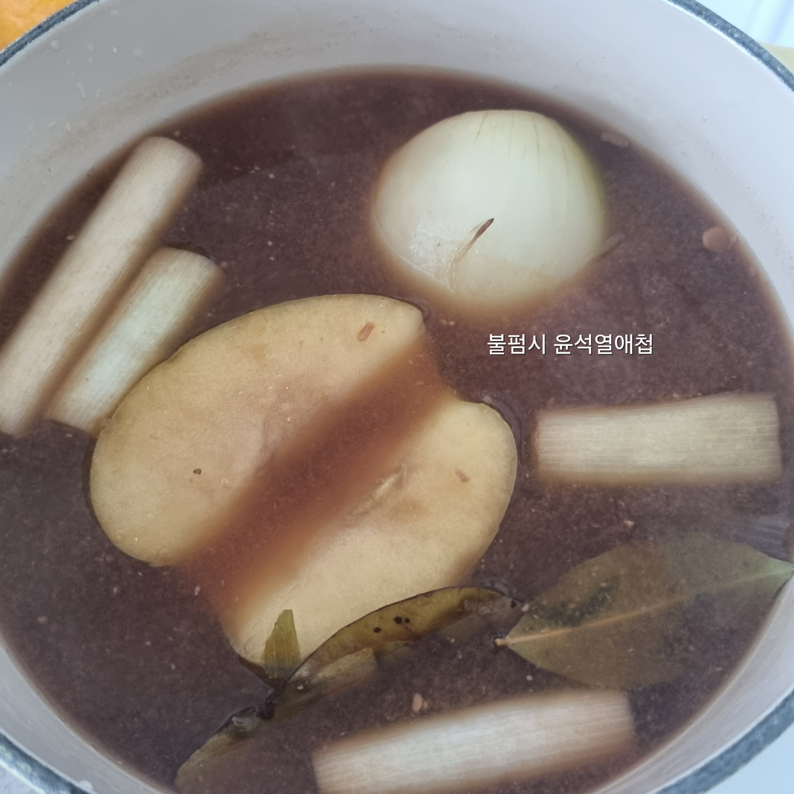 물 약 1.2리터에 파 흰부분, 양파, 월계수잎, 통마늘, 통후추, 사과 🍎, 된장3스푼(지극히 내 취향인데 물에서 된장맛이 강한게 더 맛있음), 간장2스푼