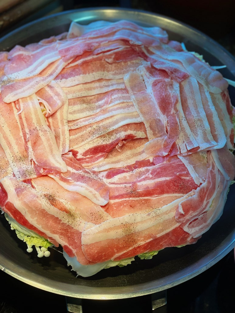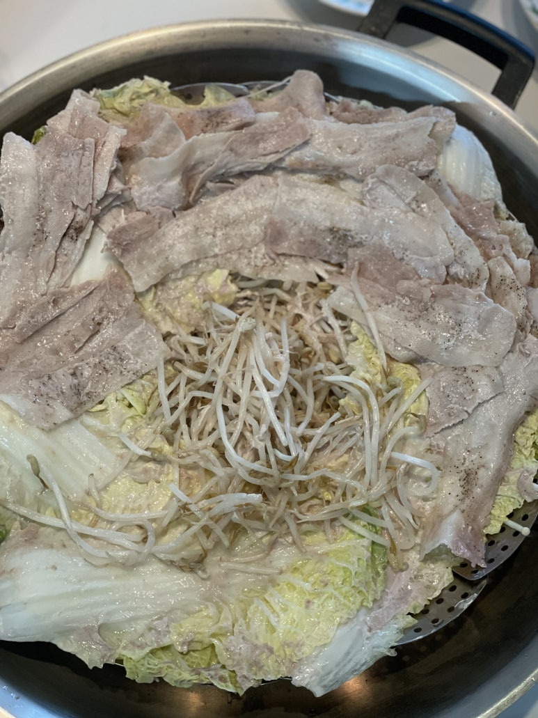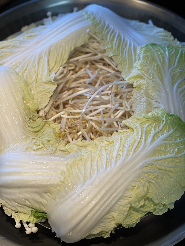 삼겹살은 맛있게 익고 배추랑 숙주는 아삭아삭한 식감으로 적당히 잘익고