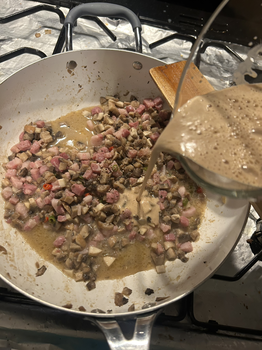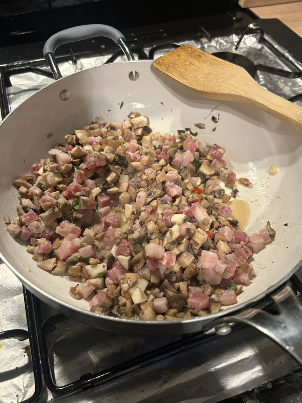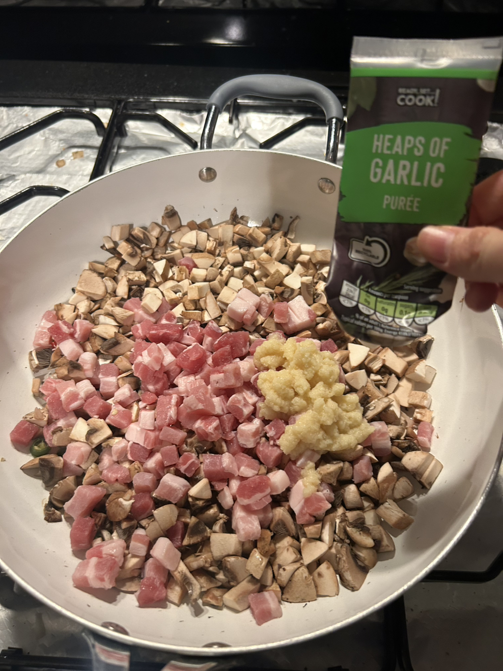 버섯+버터+간마늘+판체타+고추 를 팬에 넣어