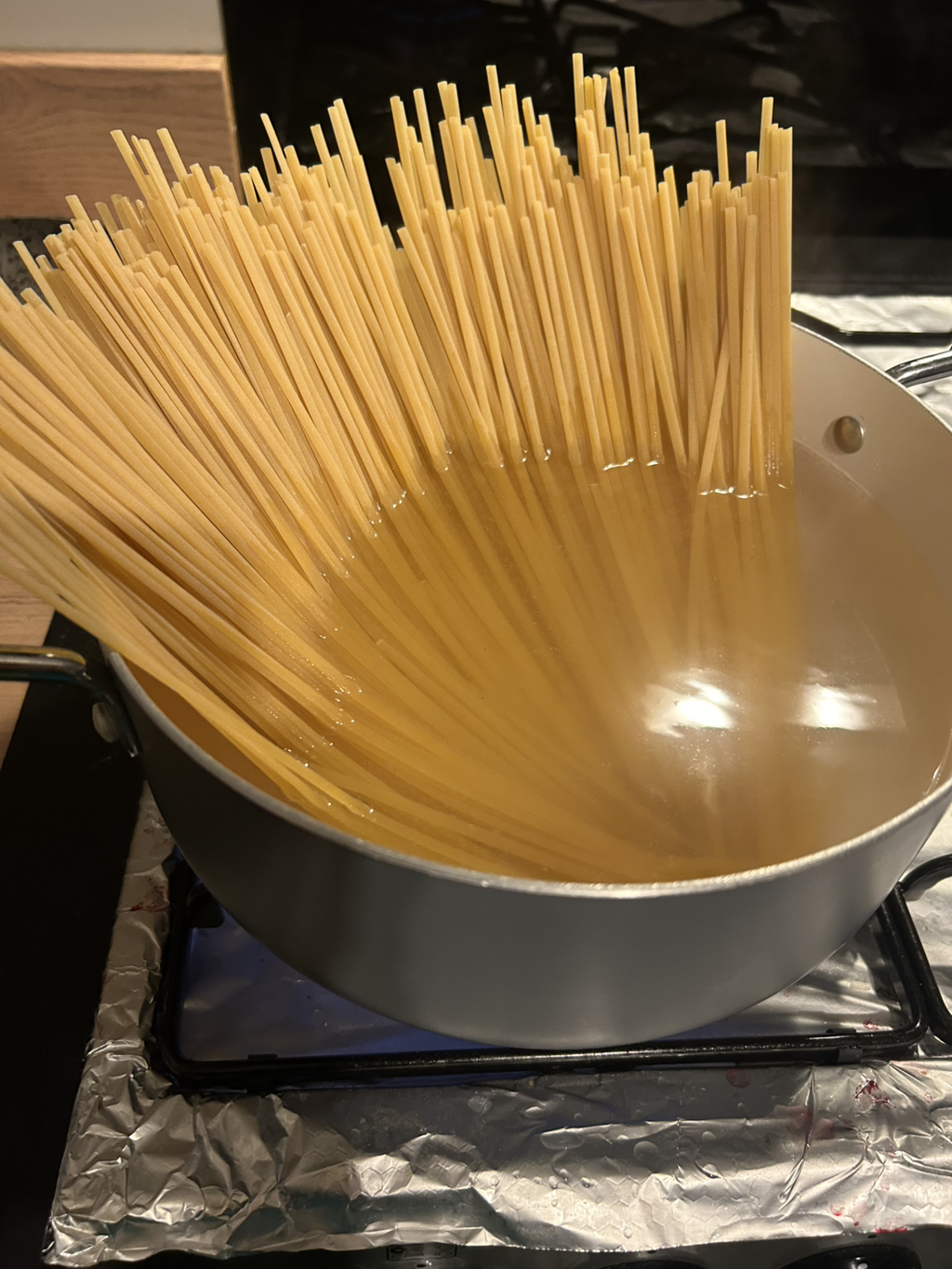 파스타물이 끓으면 물에 소금(테이블솔트)을 세번정도 흩흩흩 뿌려주고 파스타를 넣어줘