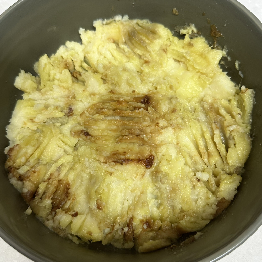 1. 삶은 고구마를 포크로 으개서 그릇 제일바닥에 깐다