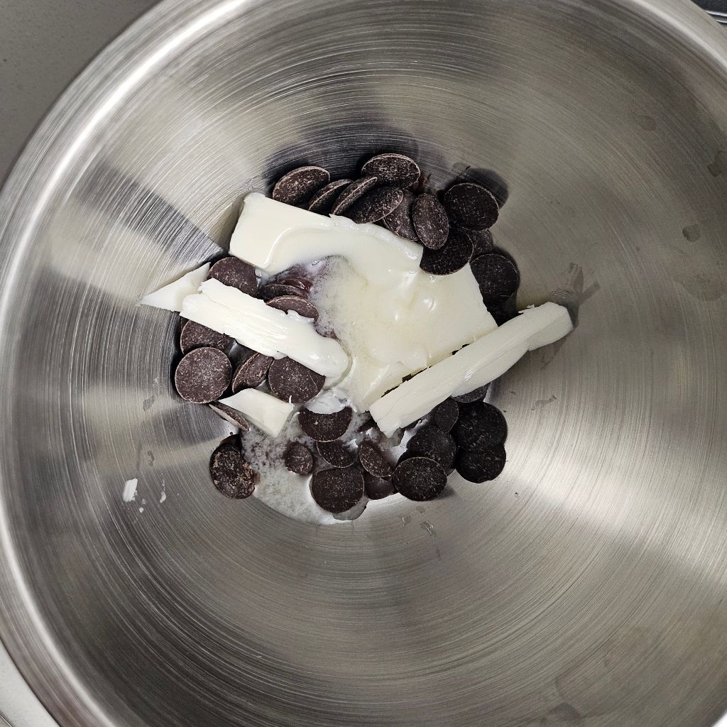 그릇에 초콜릿과 버터를 넣고 전자레인지로 돌려서 녹여주세요