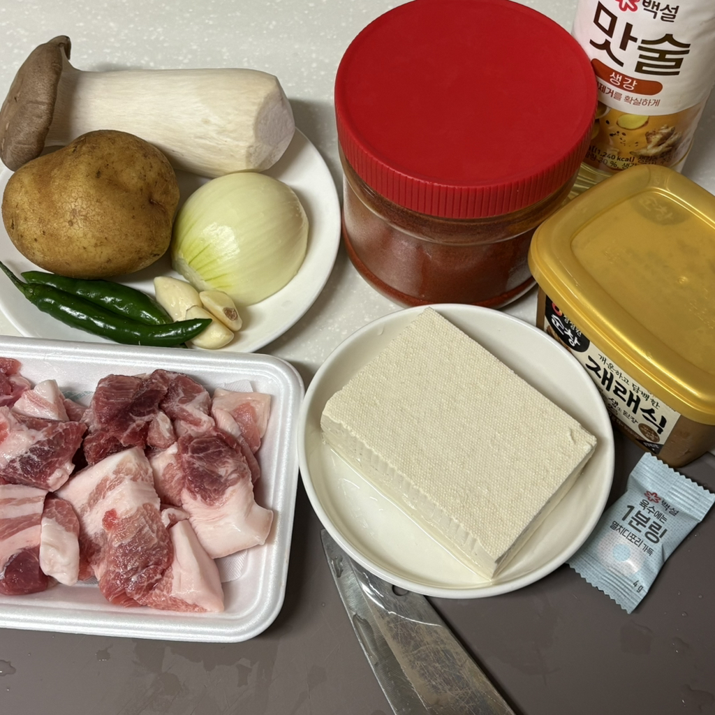 재료: 찌개용고기300g(저는 비계많은 부위를 좋아해요), 감자1, 양파1, 청양고추2, 버섯, 다진마늘, 두부, 멸치육수코인1, 된장, 고춧가루, 맛술