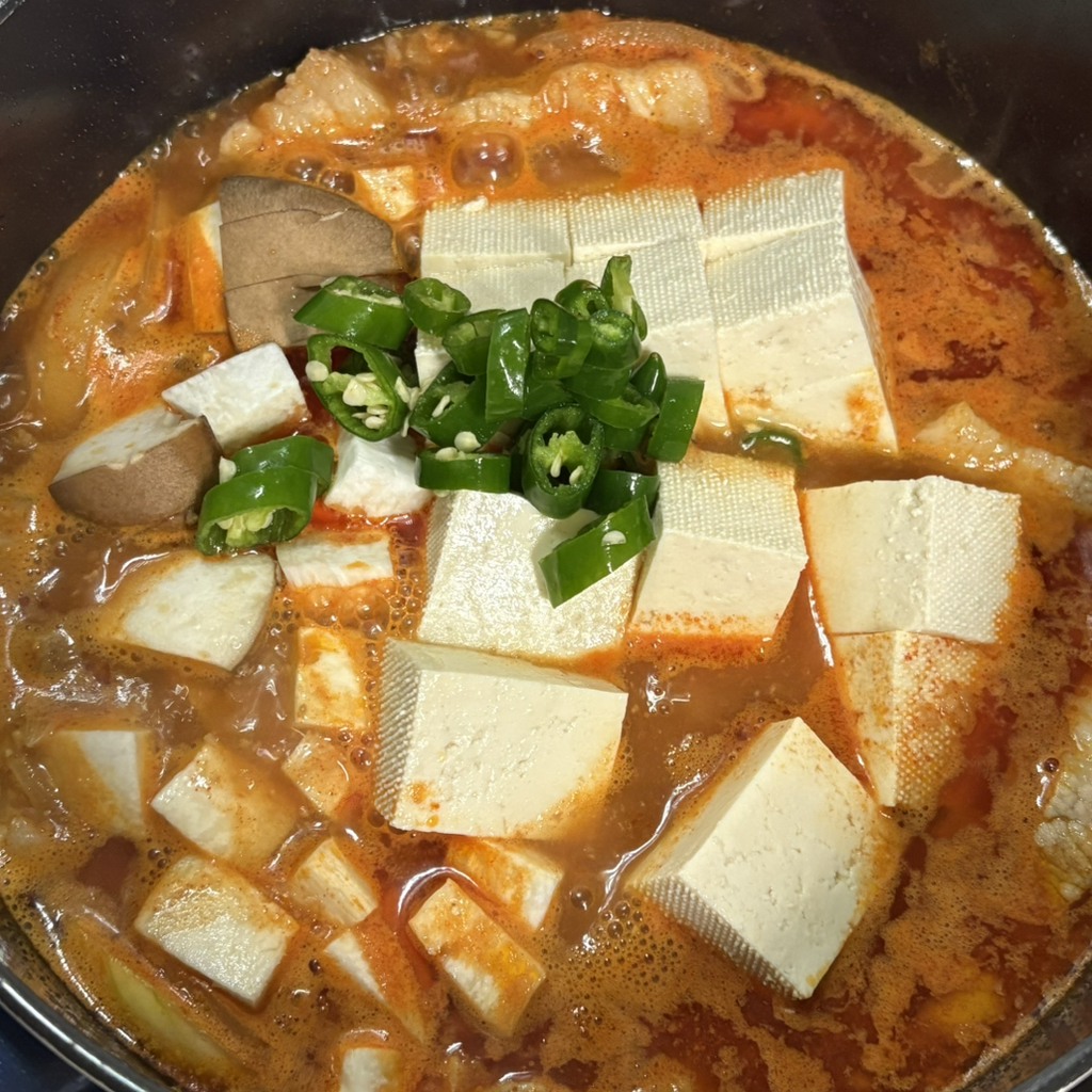 - 남은 야채(버섯, 청양고추) 넣고 두부 넣고 약불로 자글자글 끓여주세요
