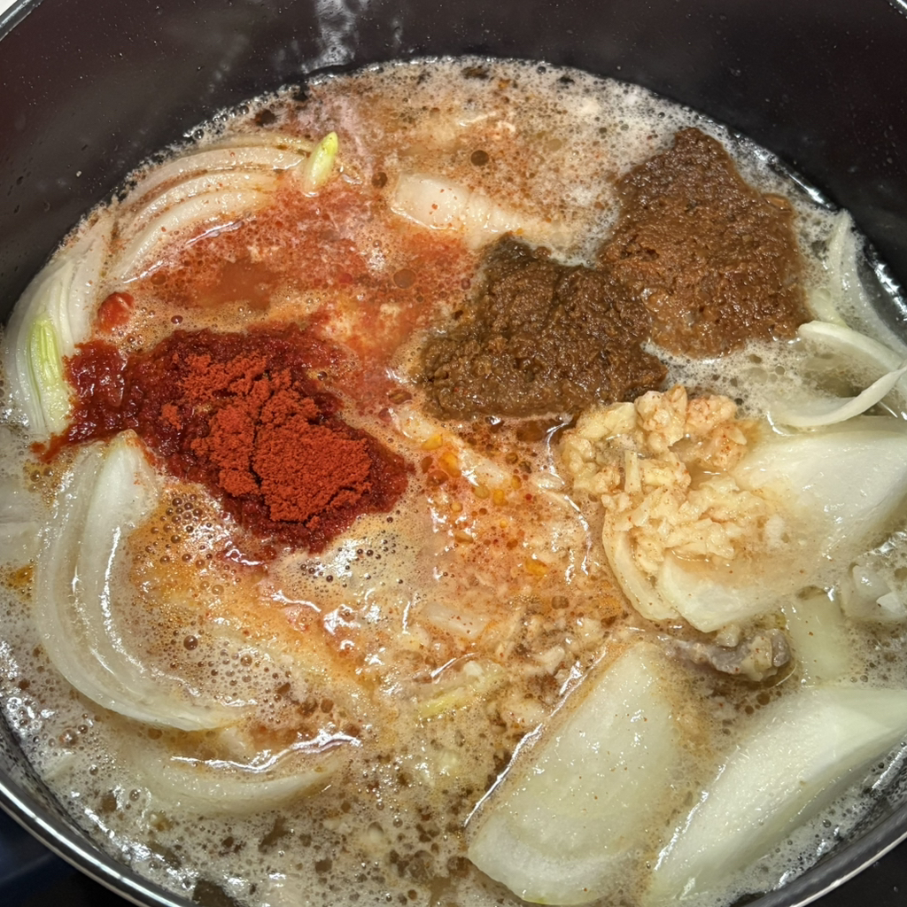 - 끓기 시작하면 된장3숟가락, 다진마늘 1숟가락, 고춧가루 1숟가락 넣어주세요