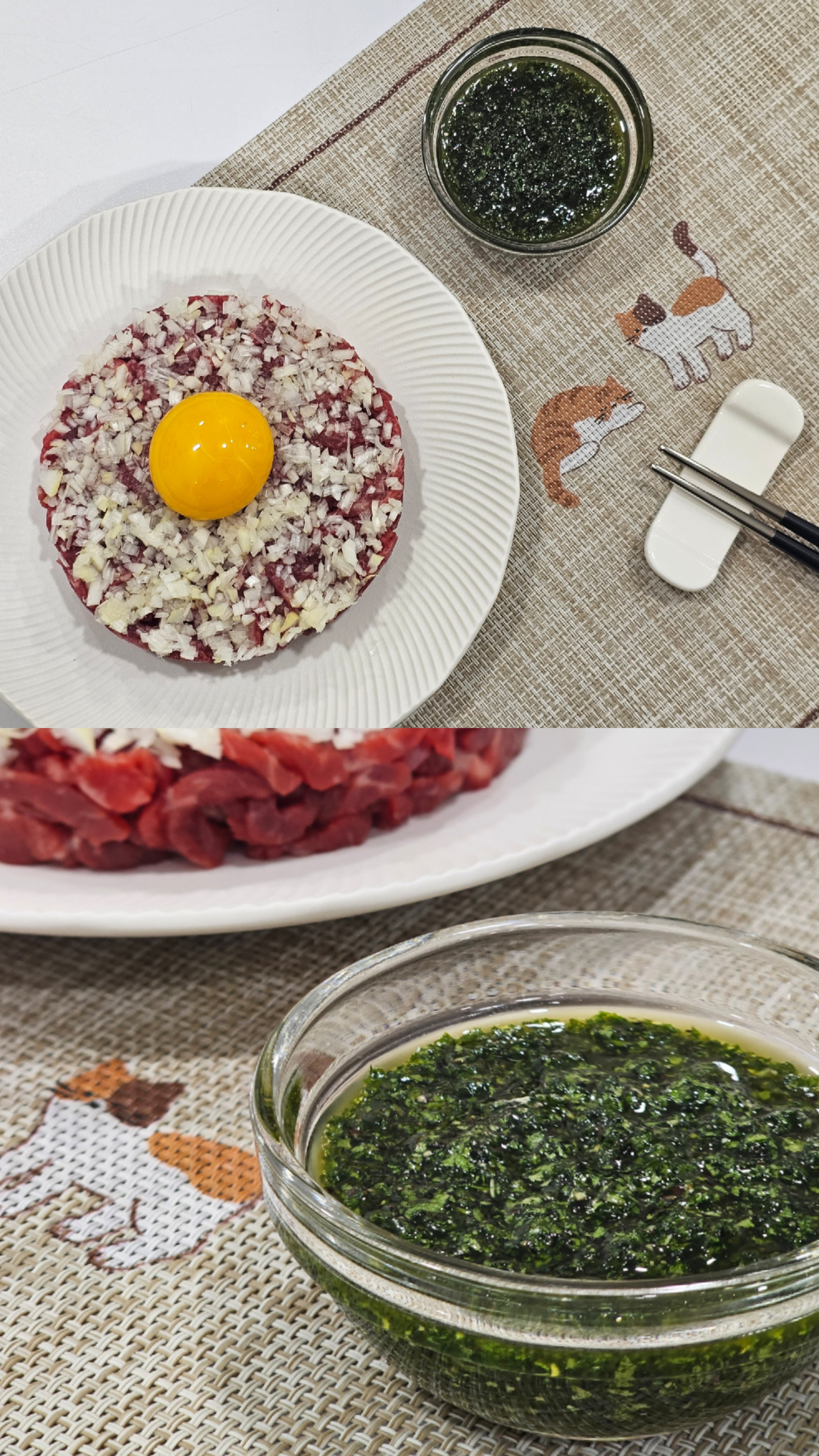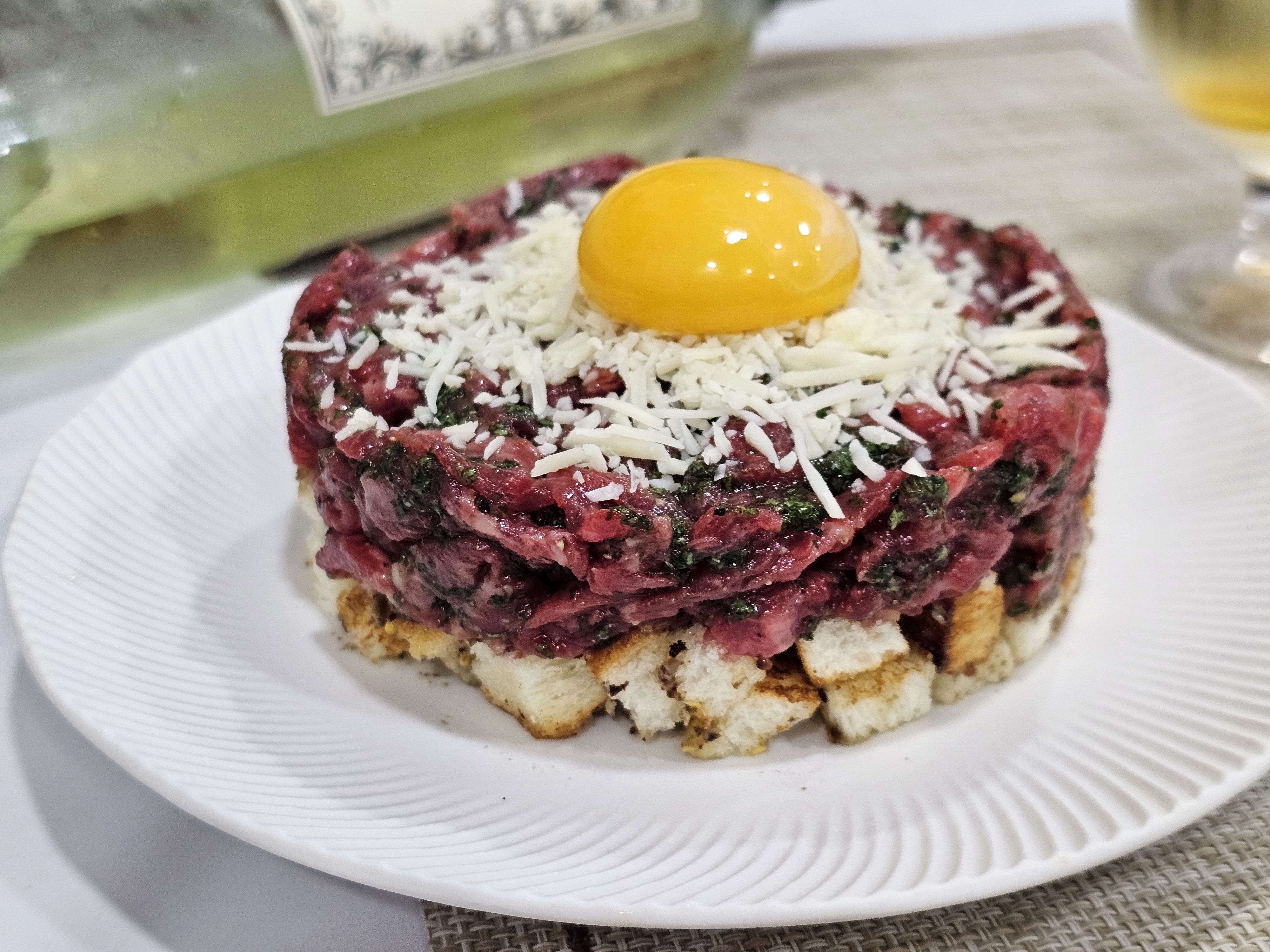 치미추리소스에 버무린 육회 + 크루통 + 그라나파나도 + 계란노른자
