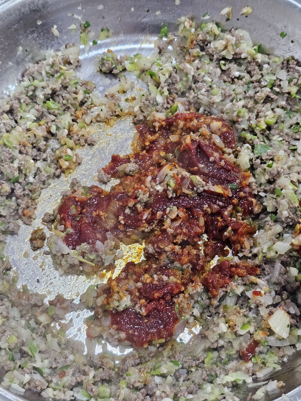 2. 양파, 청양고추, 표고버섯, 남은 육회 넣고