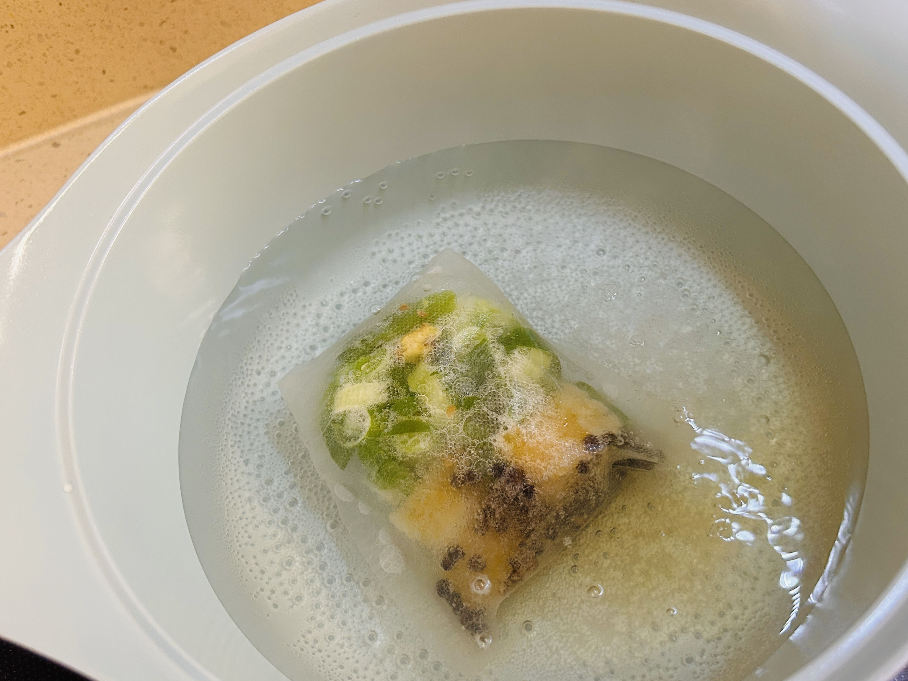 깨끗한 냄비에 재료 (다진마늘 2숟가락, 통후추 2숟가락, 대파 1/3개, 청양고추 1개)를 육수망에 넣고 센불에 끓인다